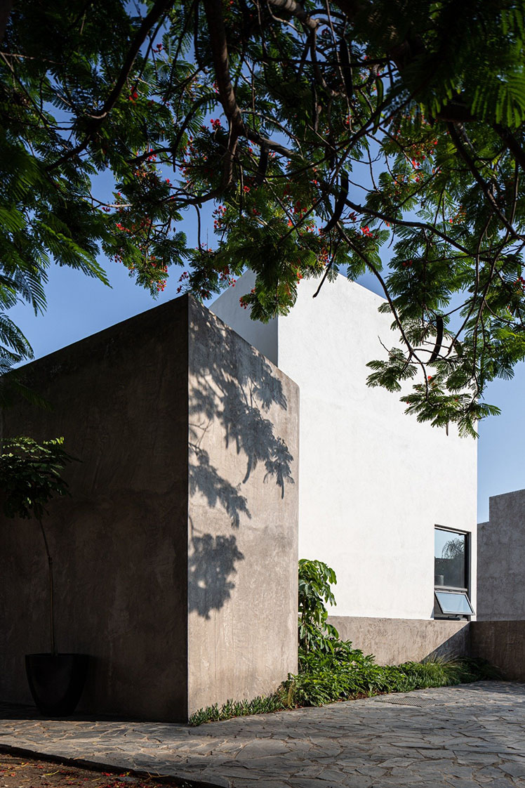 La casa se concibe como un sistema de tres cuerpos: el umbral de acceso en resonancia con el tabachín, el espacio social abierto y luminoso y el volumen privado más contenido.