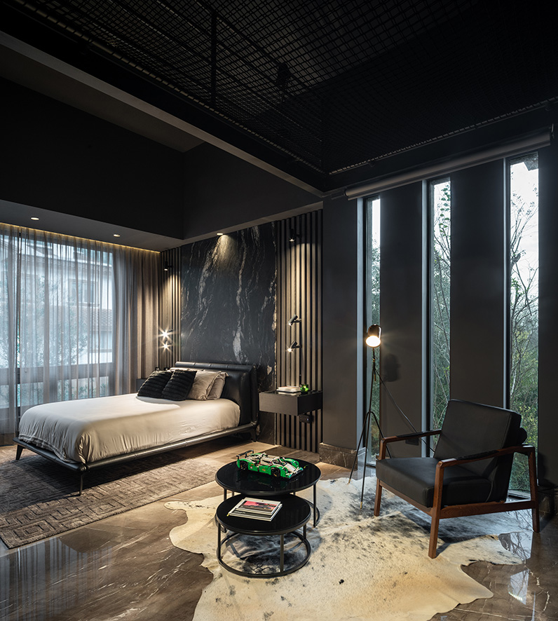 La organización de los espacios dentro de la casa sigue un enfoque estratégico que asegura que cada área tenga una conexión visual y emocional con el exterior, desde el dormitorio, con sus grandes ventanales que enmarcan el paisaje natural, hasta los detalles en el diseño de la escalera, que se eleva como un camino hacia el interior de la casa, todo en la Casa MDSLRDF está pensado para que el entorno sea una extensión del hogar.