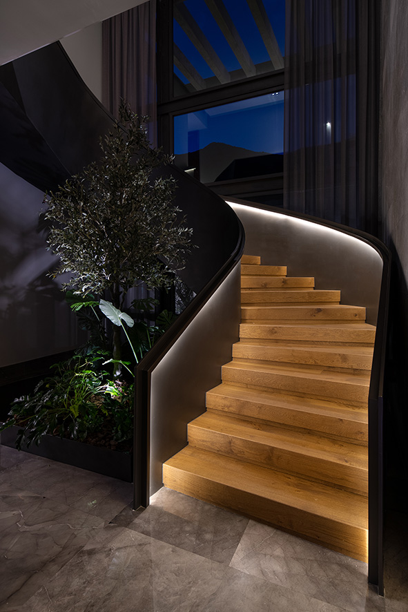 La disposición de la casa responde a la intención de crear ambientes instintivos, donde la armonía entre los materiales y la iluminación juegan un papel fundamental.