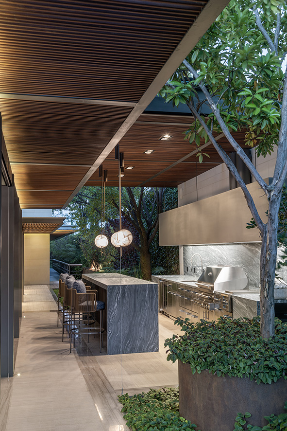 El corazón del proyecto fue el rediseño del jardín, la demolición de una estructura elevada permitió ampliar el área verde y redefinir su relación con el espacio habitable, a partir de ello, se diseñaron una serie de terrazas exteriores habitables, pensadas como transiciones suaves entre la arquitectura y la naturaleza, estas plataformas, cubiertas y descubiertas, fomentan la vida al aire libre y a la vez preservan la atmósfera silenciosa y sofisticada del interior.