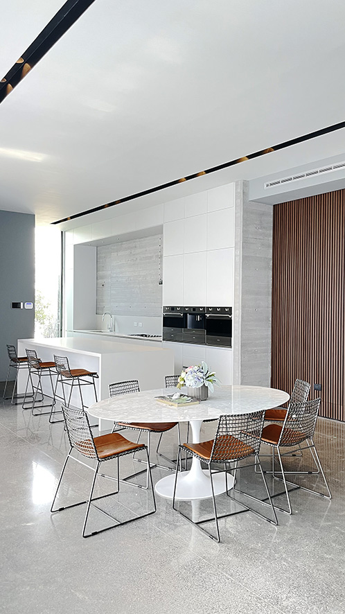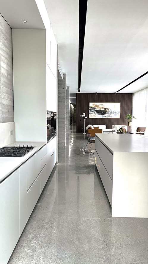 La elección de materiales desempeña un rol fundamental en esta integración con el entorno, el concreto expuesto, combinado con la calidez de la madera y la elegancia de la piedra natural, aporta una paleta de colores neutros que refuerzan la estética orgánica del diseño, estos materiales no solo responden a la necesidad de crear un espacio duradero y funcional, sino también fusionar la vivienda con el paisaje sin alterar su belleza natural.