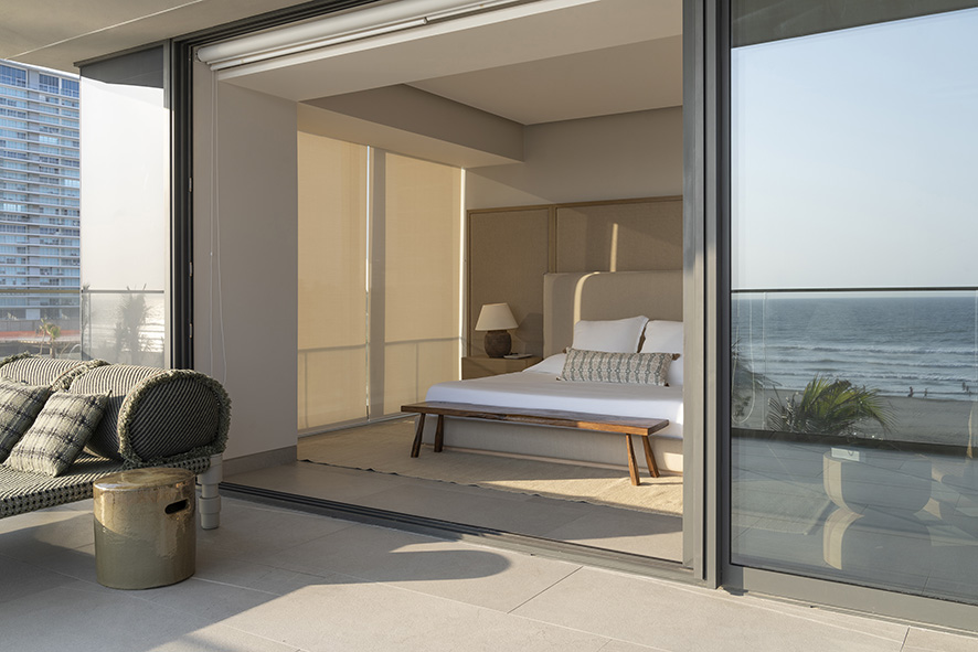 La paleta de colores utilizada en este proyecto tiene una conexión directa con el entorno marítimo: tonos neutros que evocan la serenidad del mar, complementados con acentos oscuros que aportan profundidad y contraste, estos últimos provienen de materiales de origen nacional, como el recinto volcánico y las maderas de encino carbonizado, los cuales además de su belleza, aportan una sensación de calidez y conexión con la tierra mexicana.