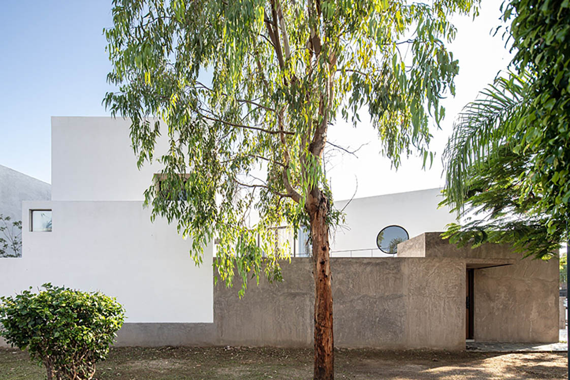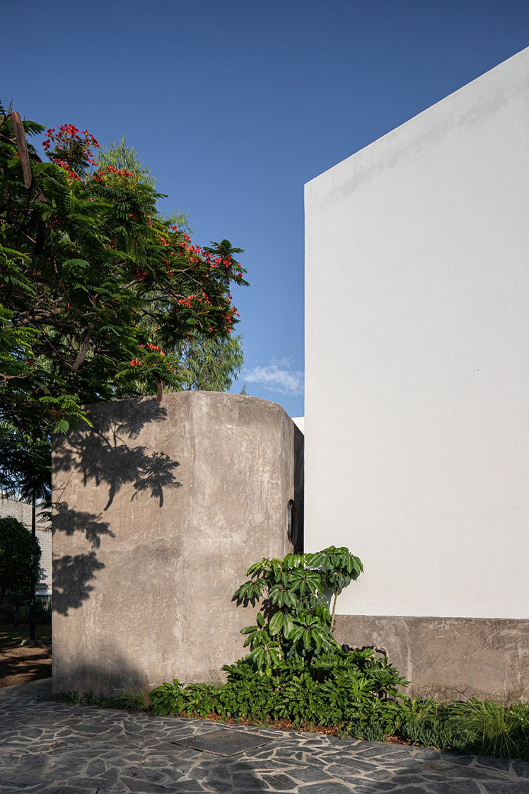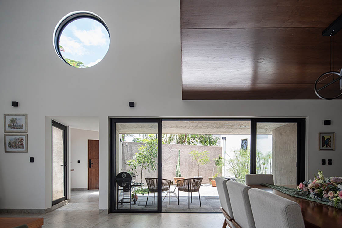 Desde la calle, la arquitectura encuentra en el tabachín su primer gesto compositivo, un umbral natural que prepara la llegada y orienta la mirada, el acceso se resuelve mediante un zaguán contemporáneo, sobrio en materiales y solemne en proporción. El concreto aparente se combina con un óculo en la losa que deja pasar la luz cenital y proyecta al caer la tarde, la silueta fragmentada de las ramas, este umbral funciona como transición sensorial, un espacio de pausa entre la ciudad y la intimidad doméstica.