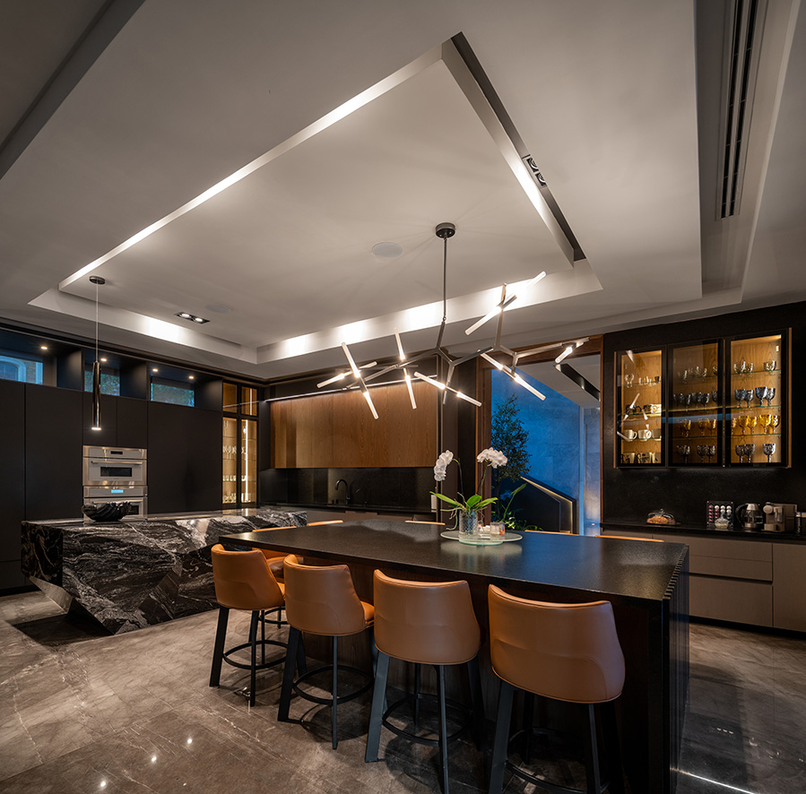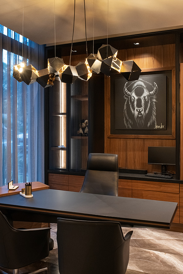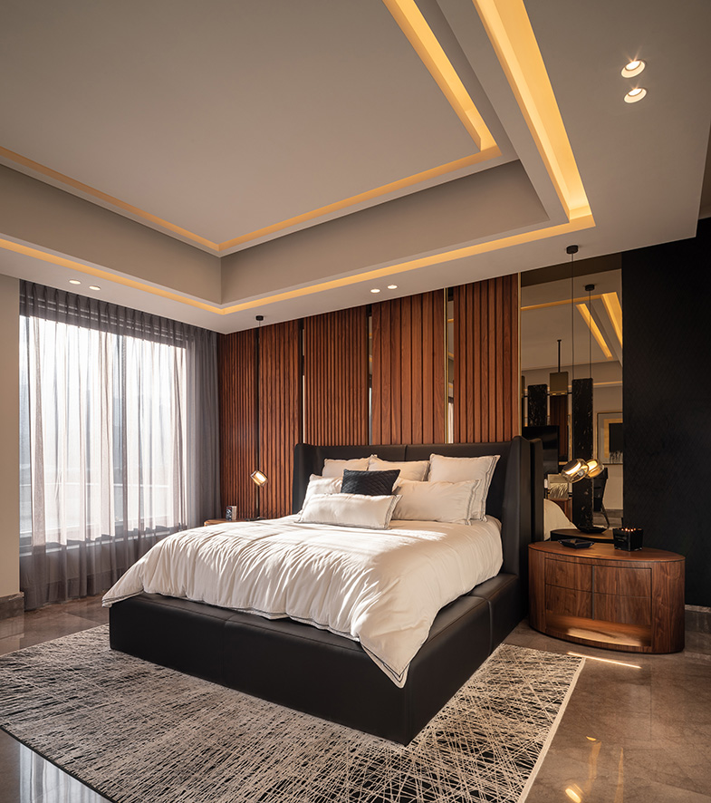 La iluminación no solo actúa como elemento decorativo, sino que se utiliza estratégicamente para crear diferentes atmósferas que complementan la estética de cada habitación.