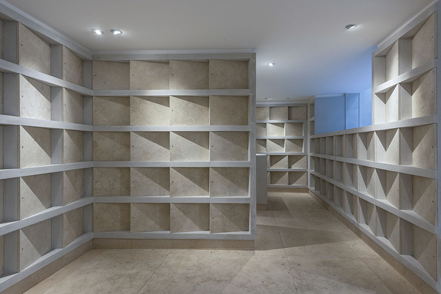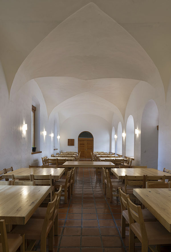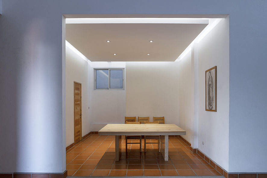 Regresando al jardín y dirigiéndonos al norte, nos encontramos con el edificio de salones, un volumen horizontal de dos niveles cuya fachada expresa solidez y sobriedad con una mezcla discreta de materiales como piedra braza, madera, acero y cristal, incluyendo nuevamente un vitral que adorna y dota de carácter al recinto. En el interior nos recibe un vestíbulo de doble altura, una pequeña recepción, escaleras y un pasillo que conduce a los salones; los acabados corresponden con la austeridad requerida, con muros enjalbegados en blanco y pisos de losetas de barro rojo. Las 6 aulas, 3 por nivel, son espacios amplios y bien iluminados, sus ventanas miran al jardín, pero que con antepechos altos se conserva la privacidad. Al terminar de recorrer el pasillo de aulas, se encuentra un pequeño bloque de cubículos, son 8 espacios privados e íntimos para escuchar y dialogar con quienes participan en los retiros.