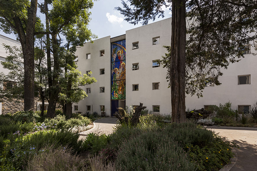 Al poniente del jardín podemos ingresar a “la Casa de Retiros”, un edificio de hospedaje de 4 niveles con una fachada sencilla y limpia, a un solo paño con un vitral de 9.20 metros de alto y 32 ventanas cuadradas completan la fachada, una por cada habitación para el descanso de los participantes de los retiros; en el interior, se accede a cada cuarto por medio de un pasillo y escaleras iluminadas naturalmente con un amplio domo de cristal, todo con un diseño lineal y funcional. Este edificio ejemplifica la austeridad y sencillez, respetando el esquema original pero agregando soluciones muy importantes para respetar las necesidades actuales.