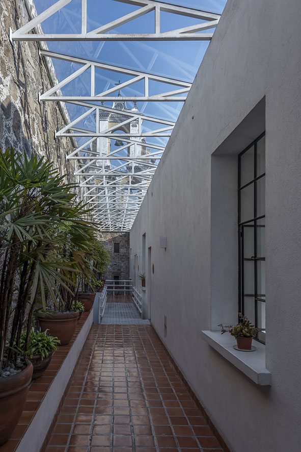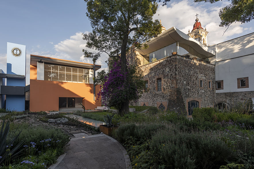 Del lado poniente del templo existe una sección del Convento antiguo desarrollado alrededor de un claustro que alberga diversos espacios rehabilitados y acondicionados para cumplir con las funciones administrativas y de servicios como lo son la librería, el comedor, oficina, habitaciones y la biblioteca; ésta última con una torre que resguarda los libros más antiguos de la casa datados entre los años 1,500 y 1,800. Sin olvidar la terraza que recrea el vuelo de una paloma con su cubierta de aluminio y fachada acristalada que da inicio al encuentro con una arquitectura contemporánea.