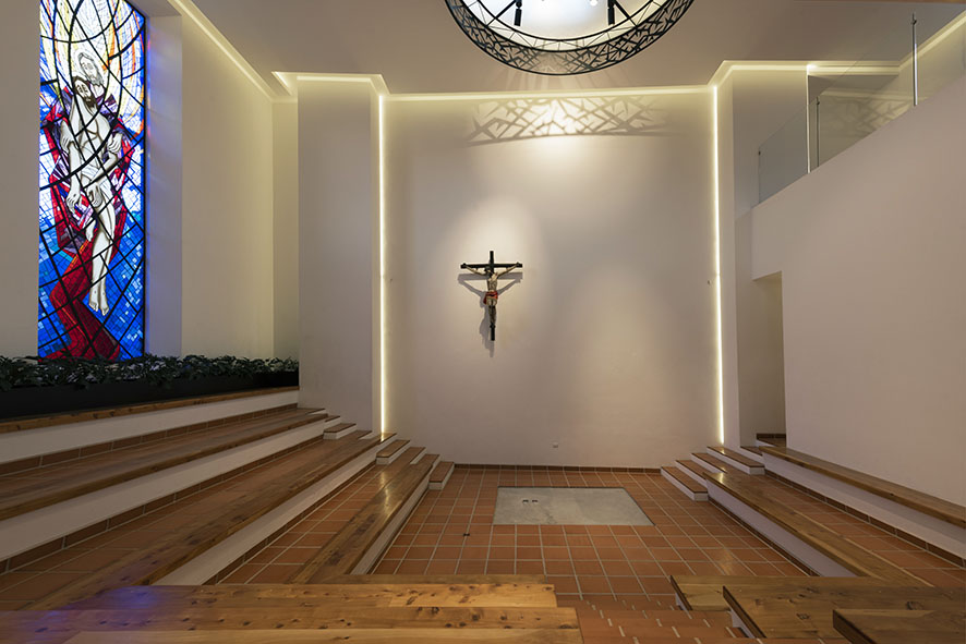 Como final del recorrido por este vergel y como remate visual del mismo, se encumbra la capilla del Centro de espiritualidad, un bloque robusto asentado en la tierra que, por medio de una sustracción amplia en el centro, se puede acceder al nártex, este permite una comunicación periférica a los cubículos por un lado y a la sacristía por el otro. Al cruzar el portal nos encontramos en un espacio amplio y bajo, flanqueado por 2 nichos diseñados expresamente para albergar iconos de la orden. Al continuar avanzando, el espacio se abre a una doble altura coronada por una lampara escultórica de lámina acanalada y al centro, el altar envuelto por unas gradas resueltas con una ligera Isóptica.