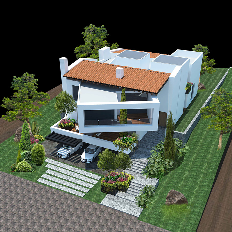 La cochera de la vivienda está cubierta por un amplio volado que también funciona como una gran terraza, este volado ofrece protección para los vehículos y al mismo tiempo crea un espacio al aire libre para disfrutar del entorno, a su vez sobre esta terraza se encuentra un volumen girado que añade un toque de originalidad al diseño, en el interior de este volumen girado, se encuentra un vano que permite el crecimiento de un árbol, añadiendo un elemento natural y verde al conjunto.