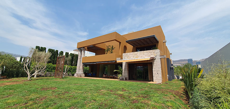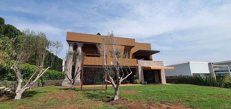 Las terrazas son un elemento destacado de la vivienda, una de ellas resalta por su imponente diseño al contar con una doble altura, sostenida por dos inmensas columnas de cantera creando un impactante efectovisual y aporta solidez y majestuosidad al diseño arquitectónico.