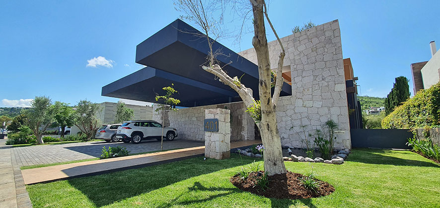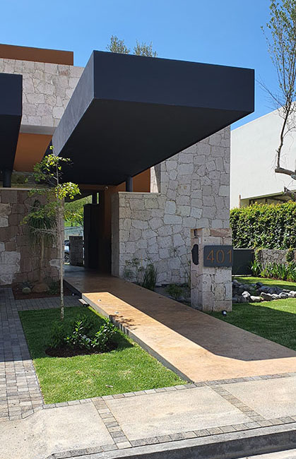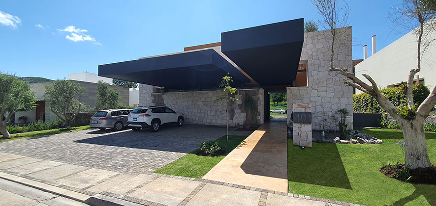 Los techos volados sin apoyos para las cocheras y el acceso peatonal crean una apariencia impresionante y moderna, mientras que el piso en piedra en el acceso añade un toque rústico y natural.