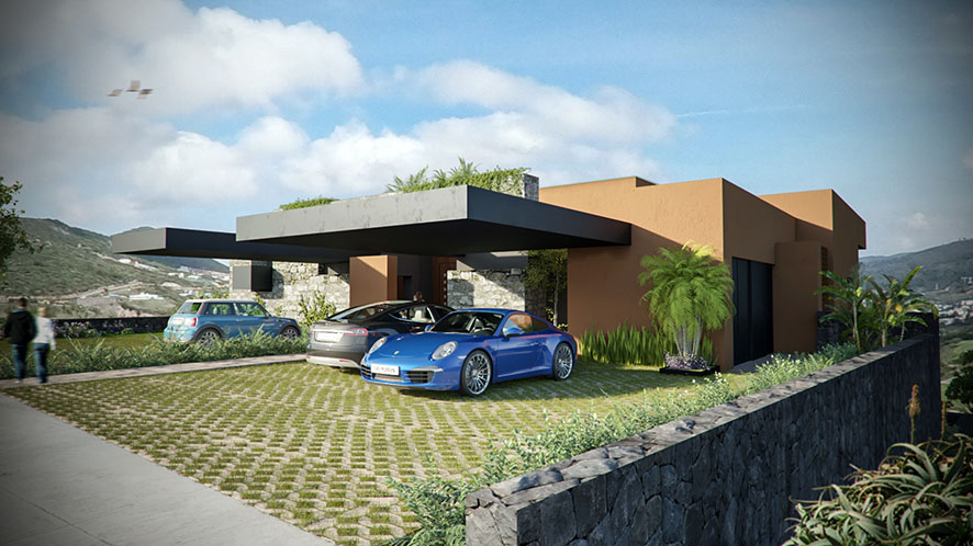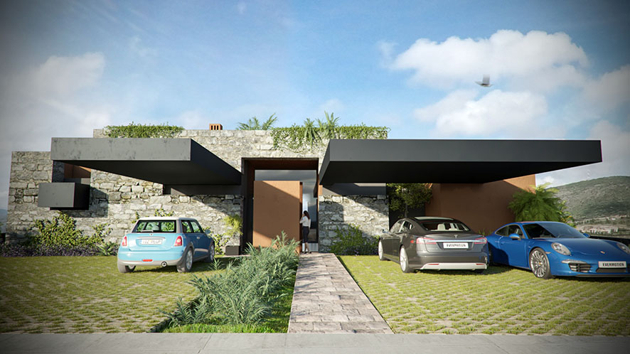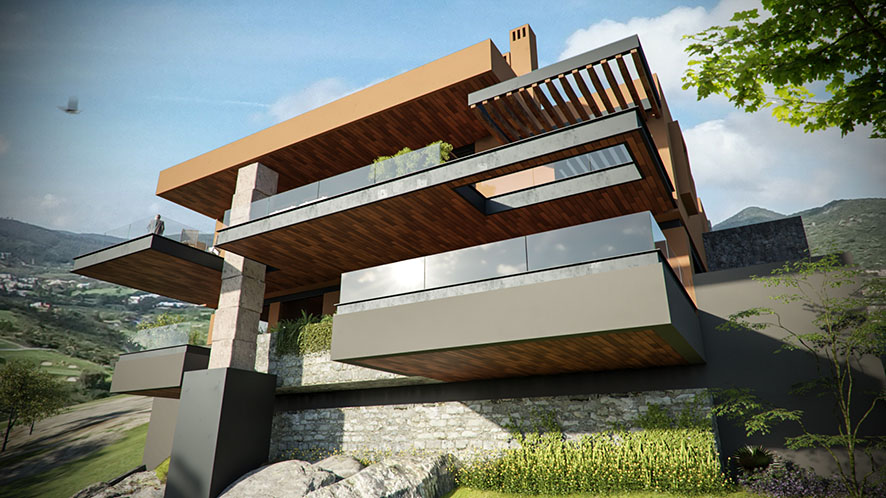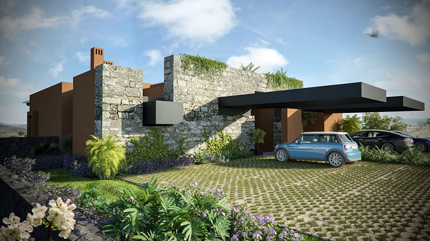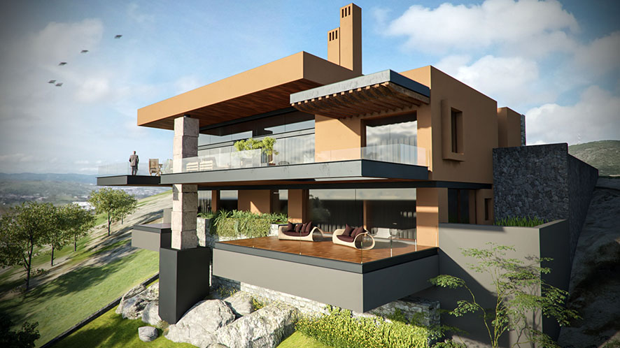 La fachada de la casa presenta muros de tonos ocres, característicos de la arquitectura mexicana, que se complementan con detalles de cantera y piedra. Estos materiales naturales aportan calidez y textura a la apariencia de la vivienda. El terreno en talud permite aprovechar las vistas panorámicas, cuenta con terrazas voladas a lo largo del talud que brindan espacios al aire libre para disfrutar del paisaje, proporcionando áreas de descanso y entretenimiento al aire libre.