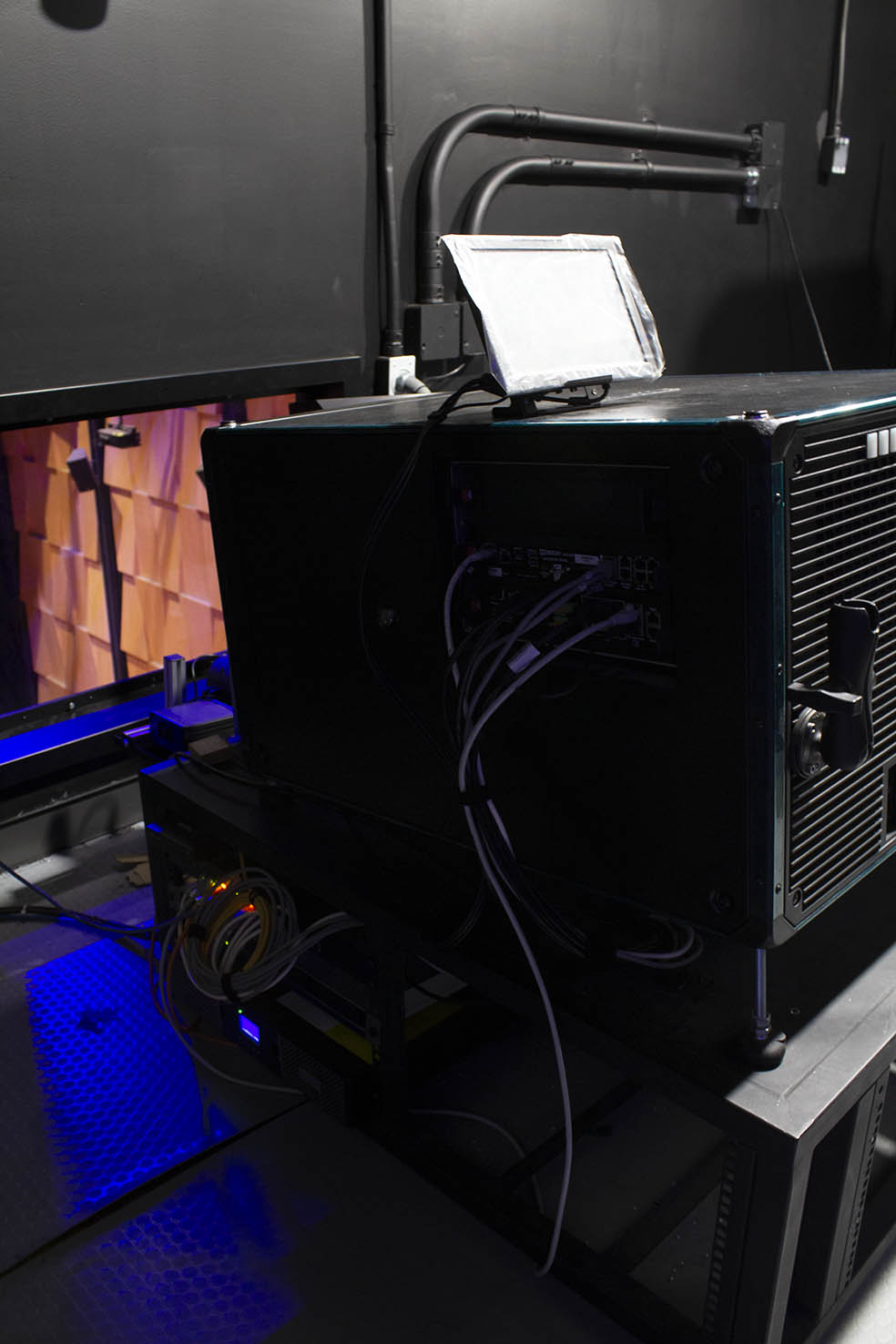 - Colocación de plafón reflejante: el diseño de plafón está pensado para tener un mecanismo fácil de manipular. Éste tendrá dos caras, la reflejante y la absorbente. En caso de que el espacio se utilice como sala de conciertos o para obra de teatro el plafón deberá de suspenderse con la cara reflejante expuesta para que reparta el sonido correctamente.