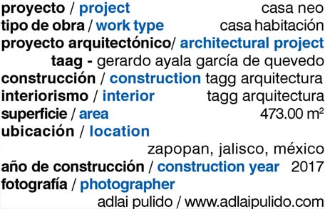 Casa Neo es un proyecto desarrollado en tres niveles con 830 m2 de construcción, en un condominio residencial al poniente de la ciudad, en Zapopan, Jalisco; con estrictas regulaciones en su manual de construcción, con el fin de mantener una imagen estética dominante, que en la actualidad nos habla más de anacronismo que de una búsqueda de belleza colectiva.