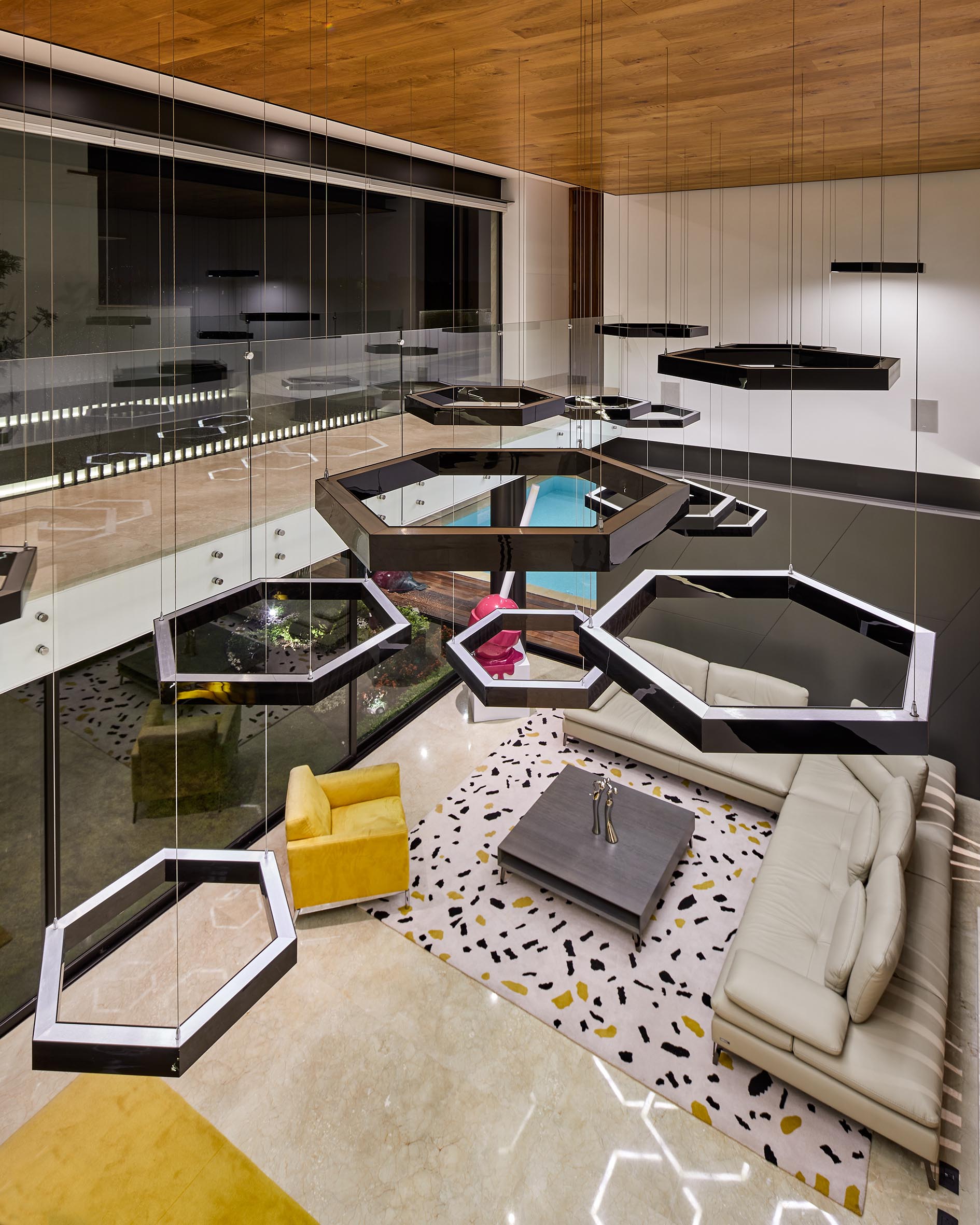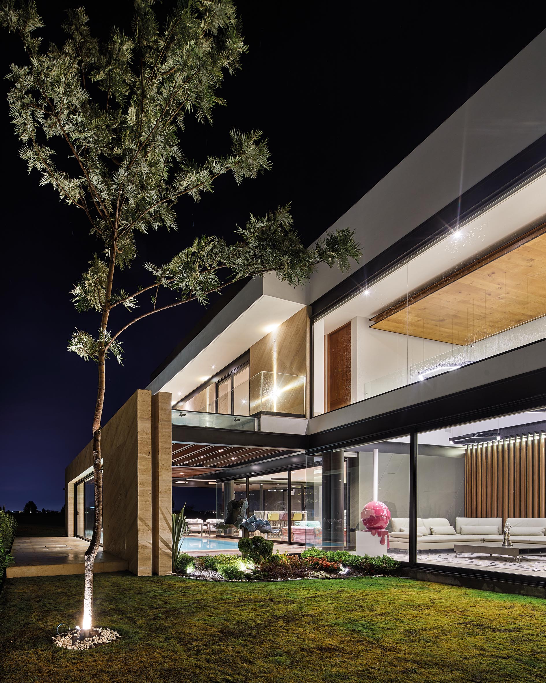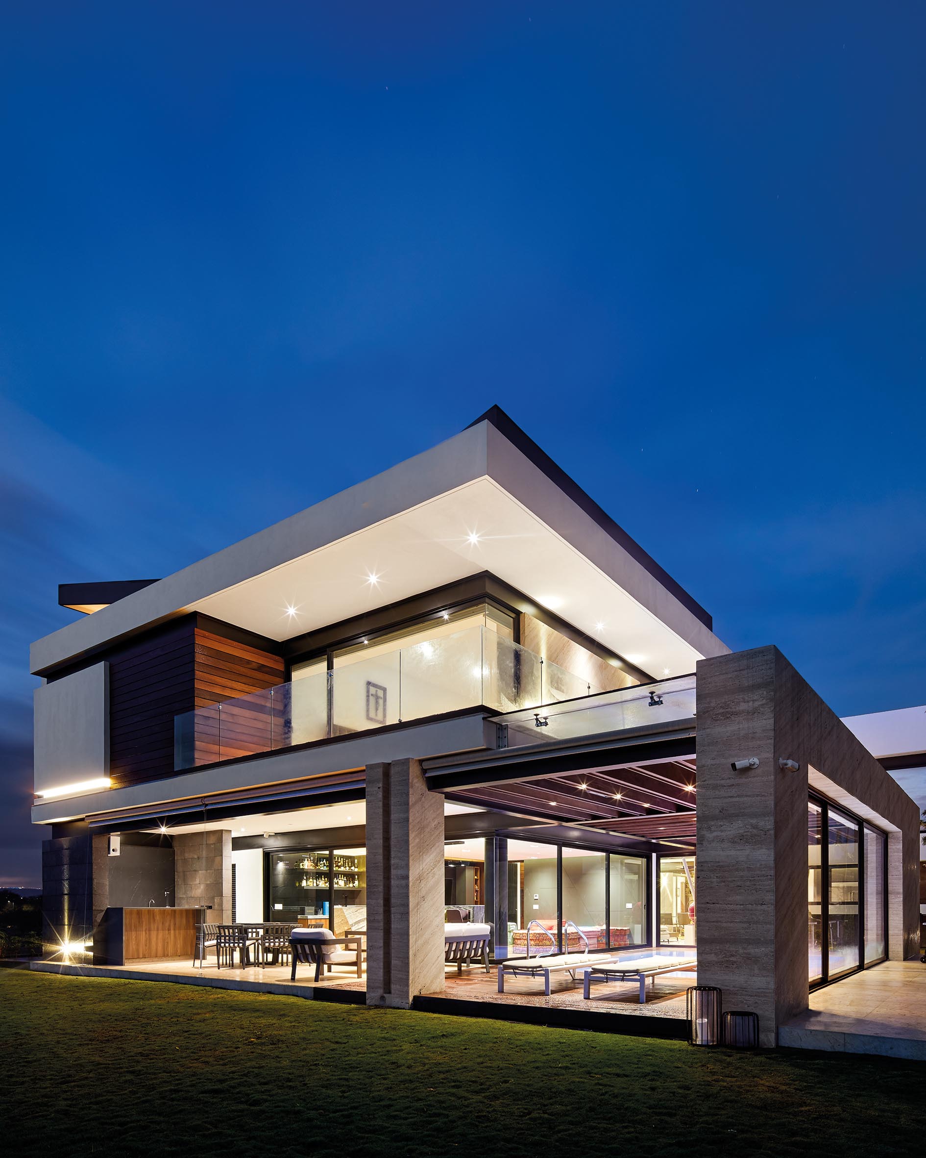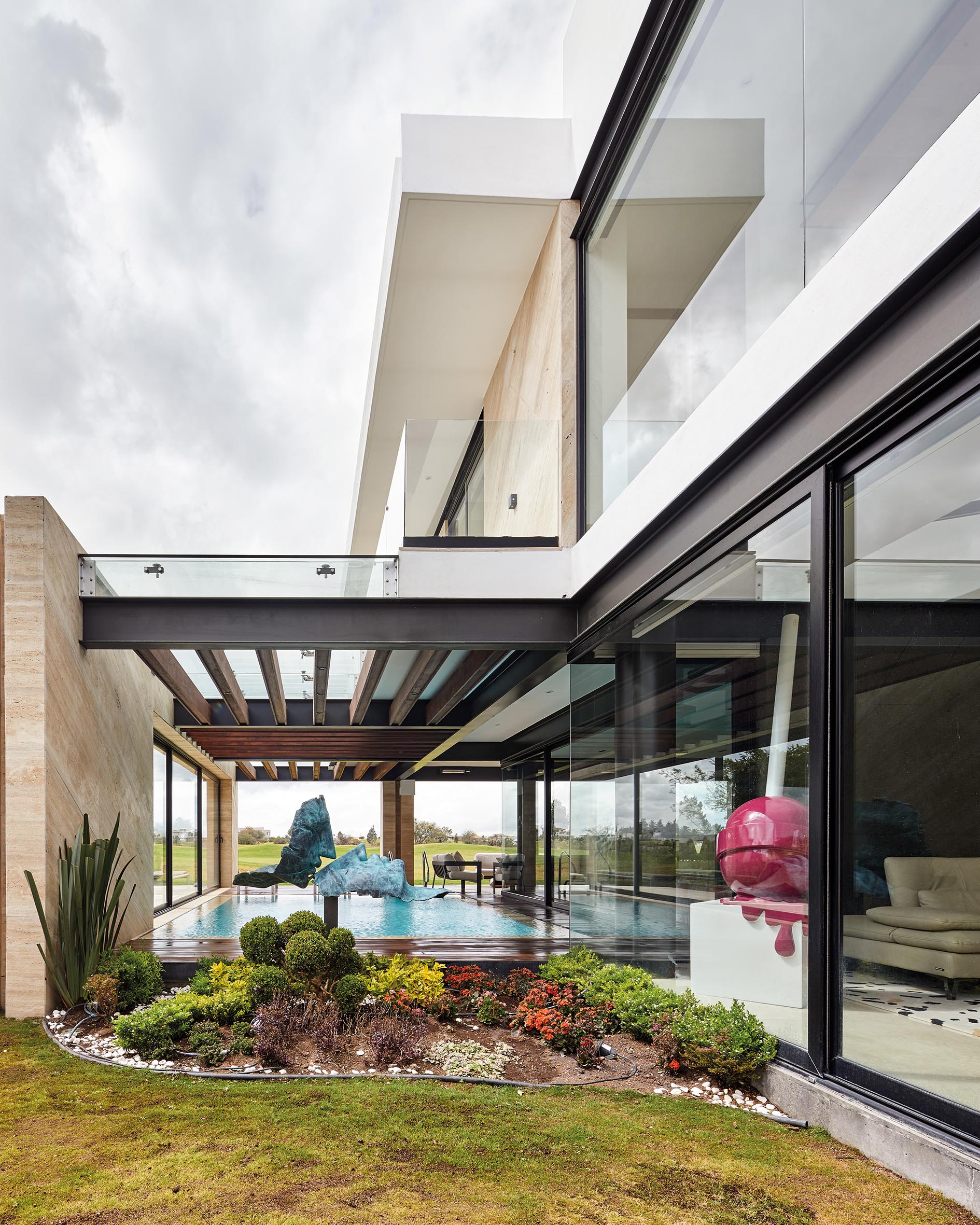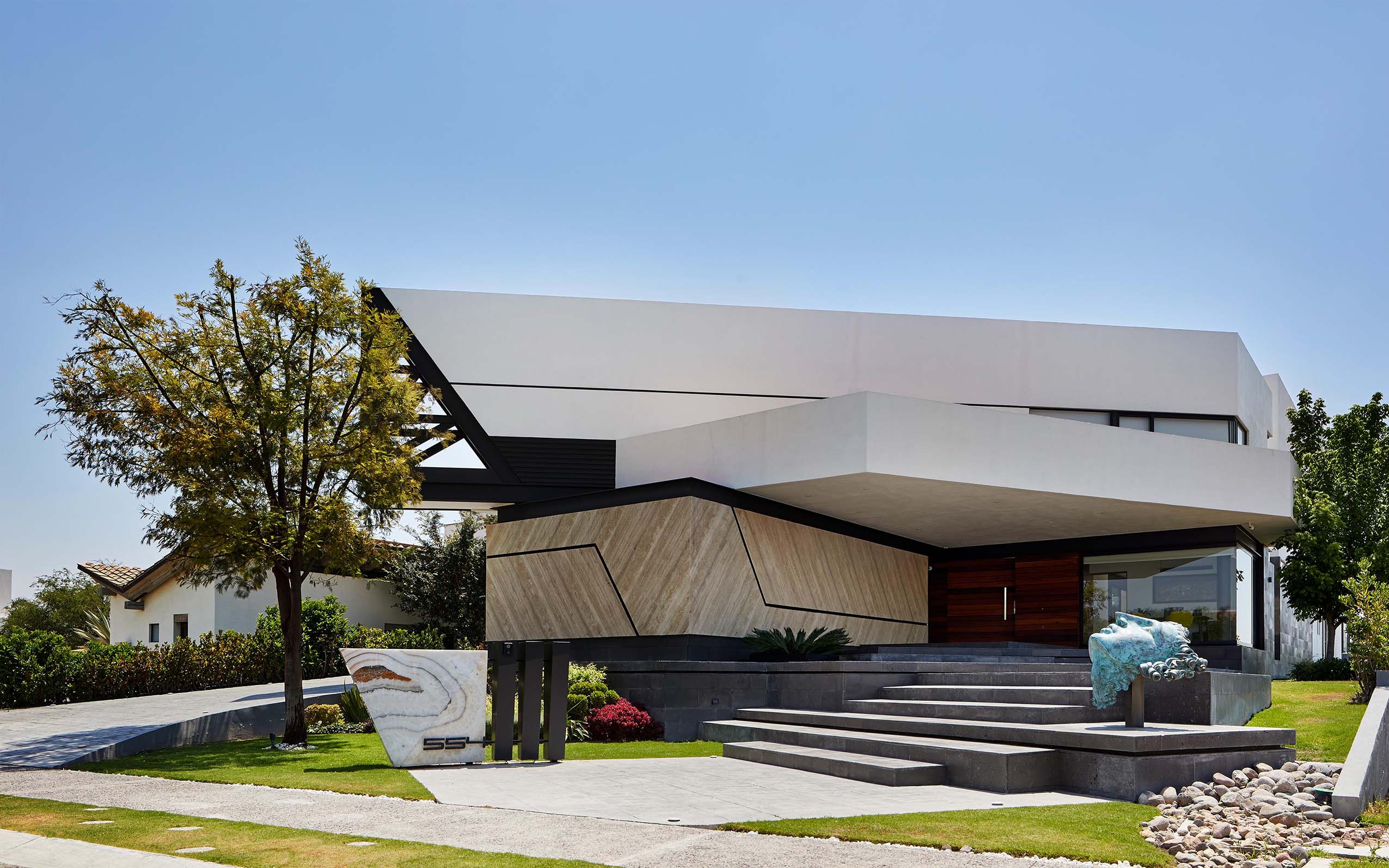 La casa es el resultado de un dinamismo tanto volumétrico como de espacios, en el que de la misma manera, los materiales como mármoles, maderas y vitrales juegan entre si logrando una casa emblemática.