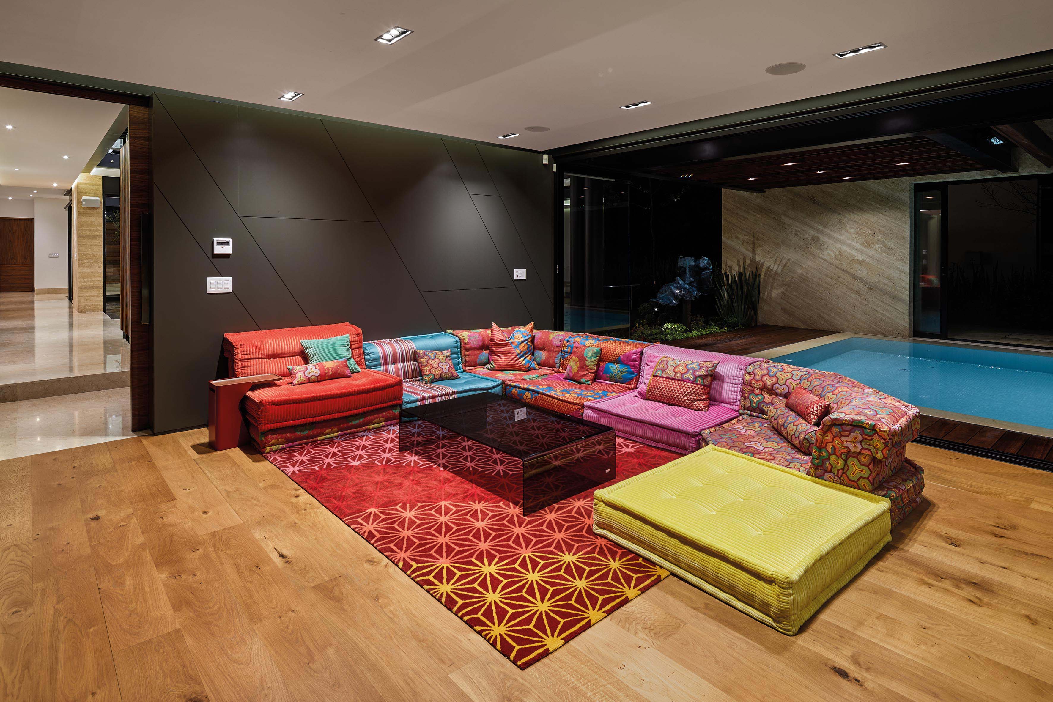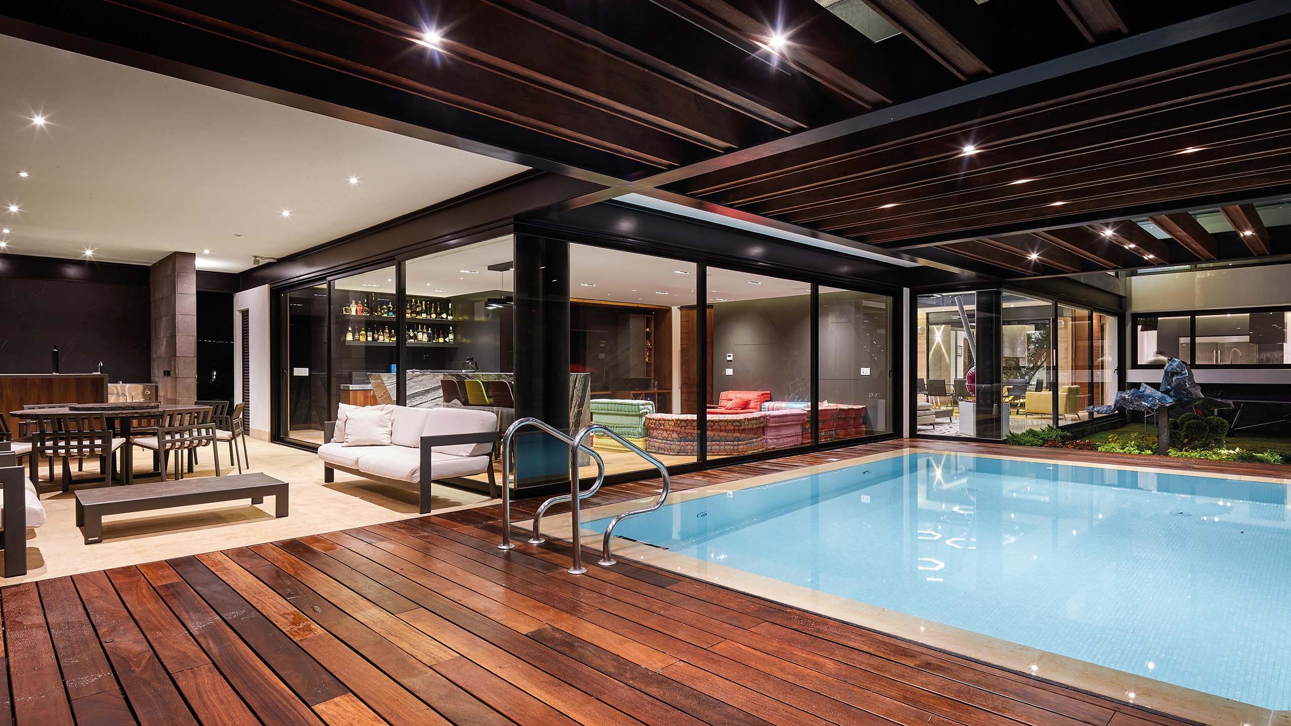 El family room es otro de los espacios principales de la casa, ya que tiene comunicación directa con la alberca y terraza exterior de la casa. Cuenta con una gran sala y bar, decoradas con madera, granitos y una combinación de colores que siguen con la línea de la casa.