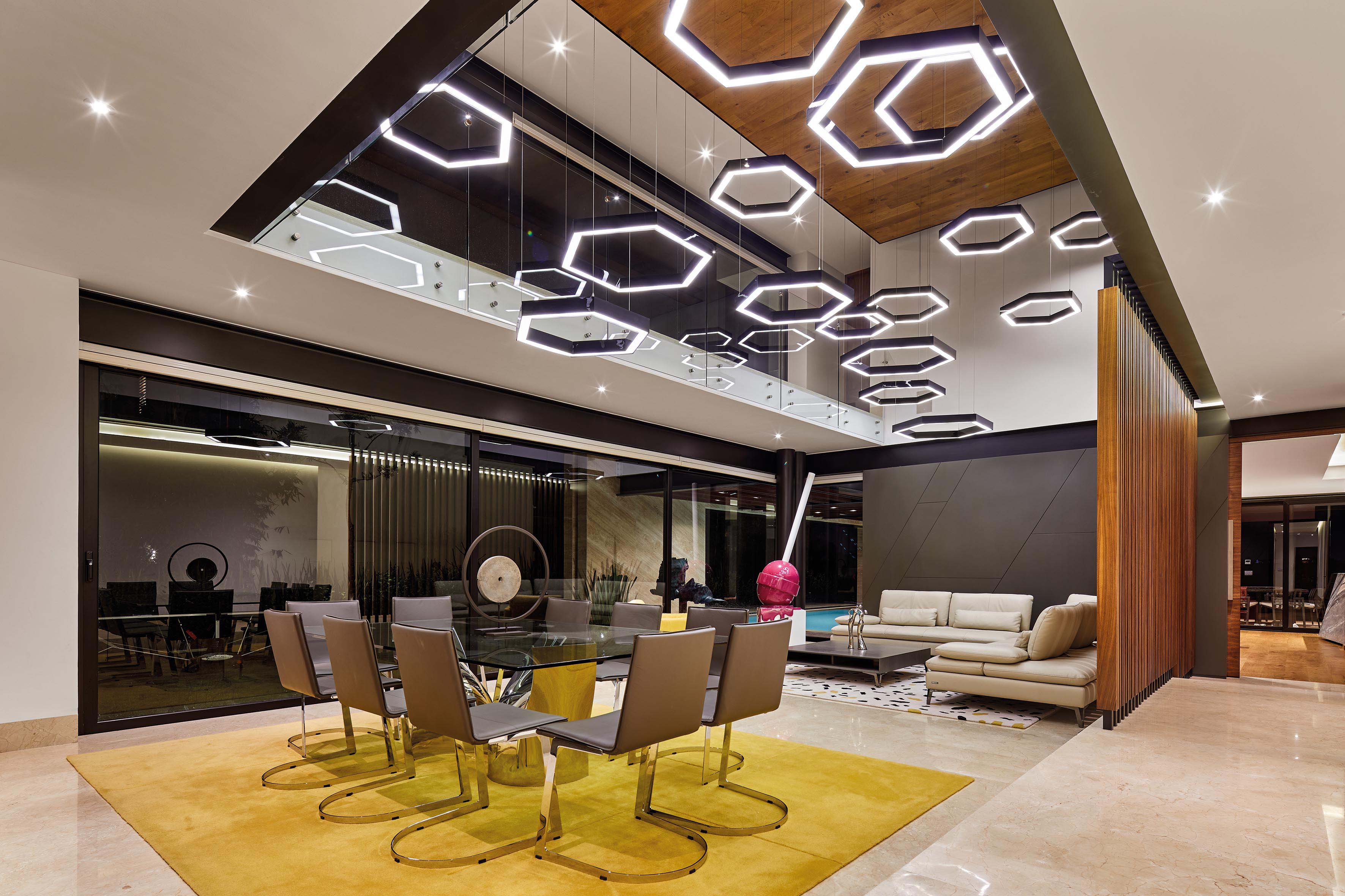Existe una comunicación directa en áreas sociales, donde comedor y estancia conviven ideando un espacio a doble altura decorado con luminarias que parecen flotar en el espacio y en el que además tenemos vistas hacia el jardín exterior y a un jardín interior, que nos vestibula la casa y brinda de luz los espacios a su alrededor.