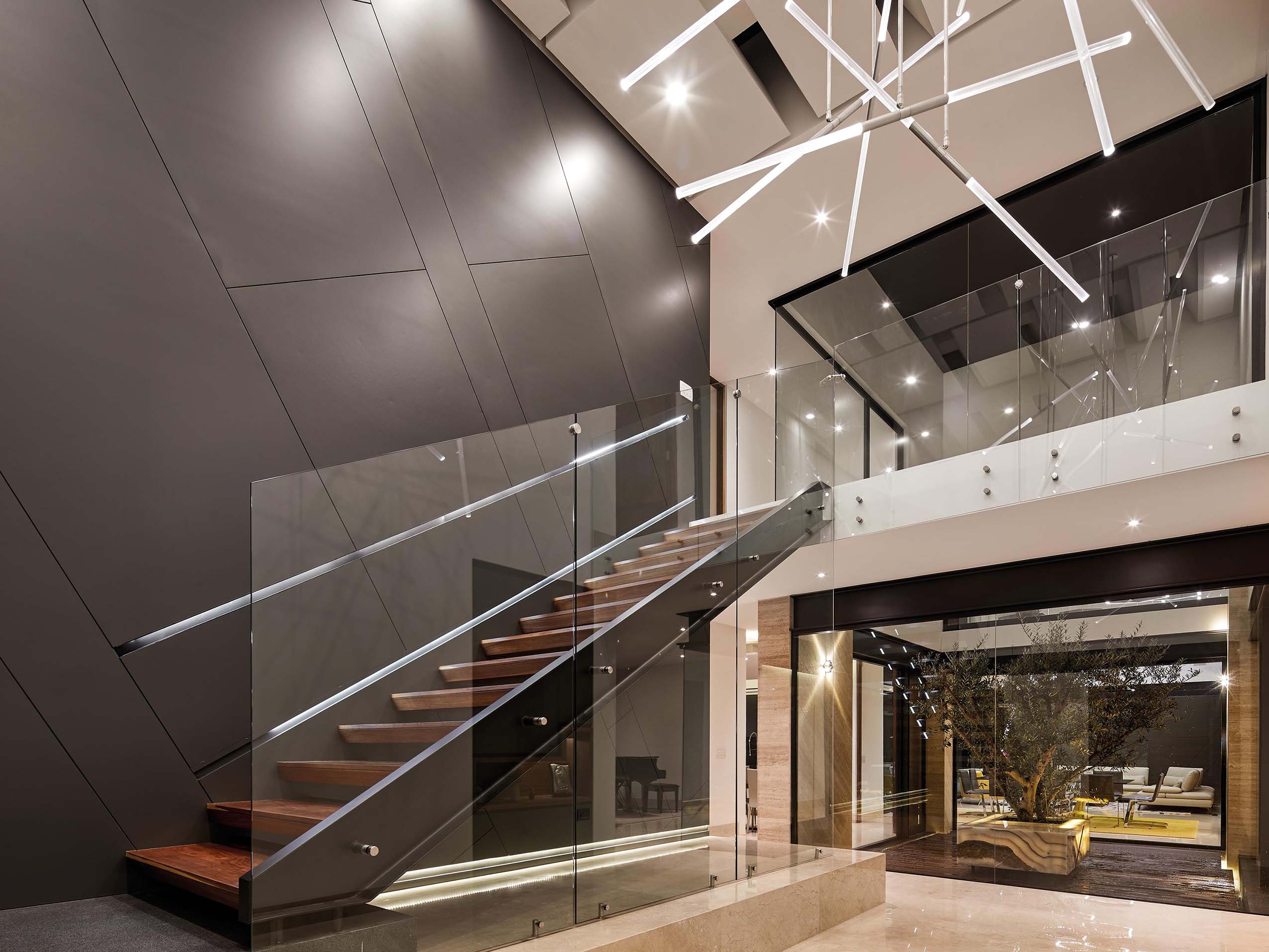 Al entrar nos recibe un hall a doble altura que integra materiales a la vista como madera en escalera y recubrimiento en muro, así como un barandal de cristal, además de tener un jardín interior como remate visual.