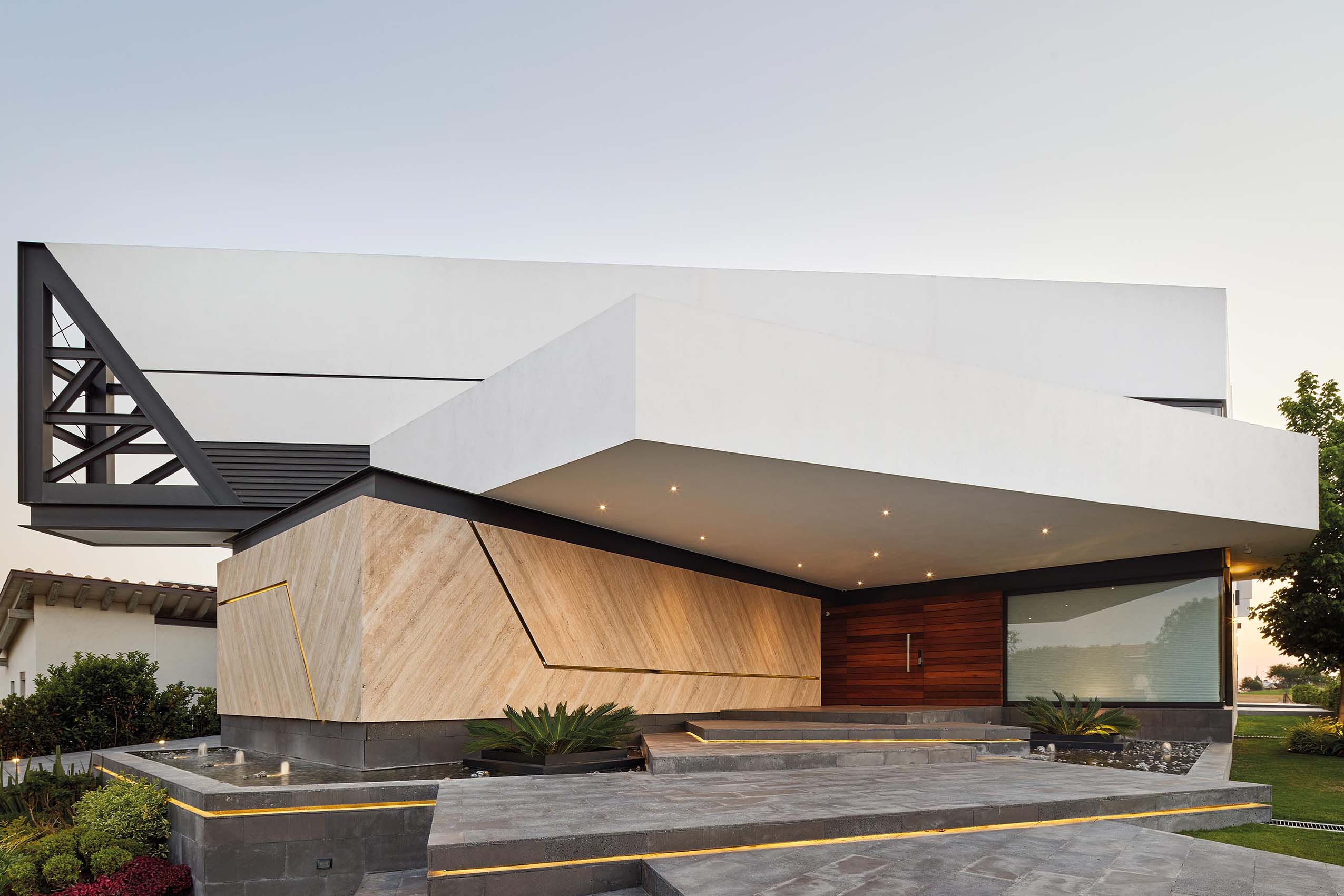 La casa nos recibe con un gran portal de acceso volado con volúmenes sólidos, dejando expuestos elementos estructurales metálicos que se fusionan con la construcción, permitiendo mostrar la arquitectura tal cuál es.