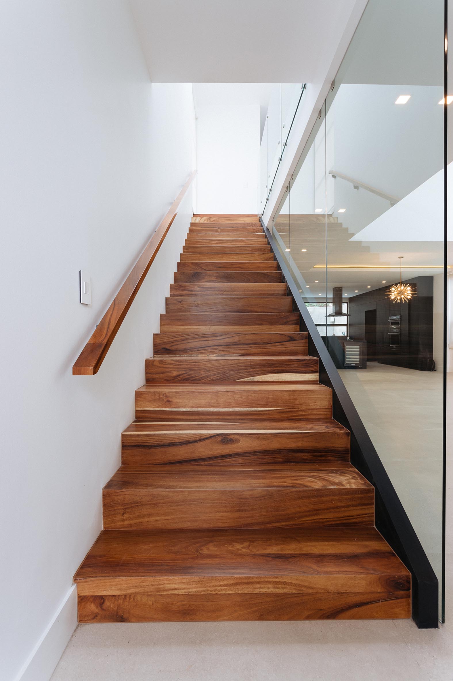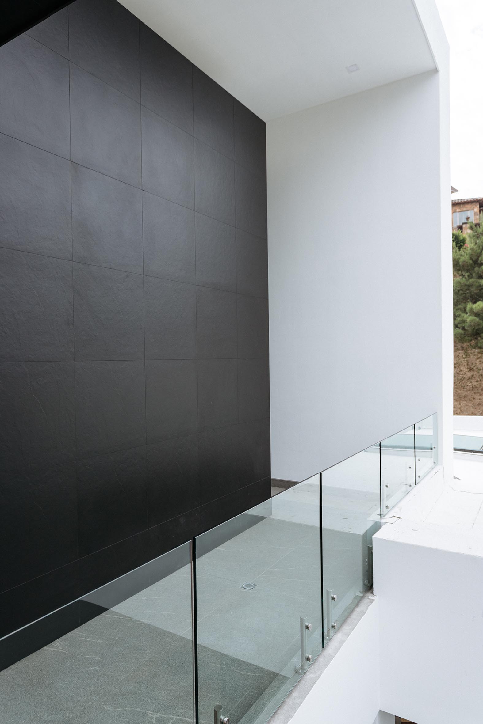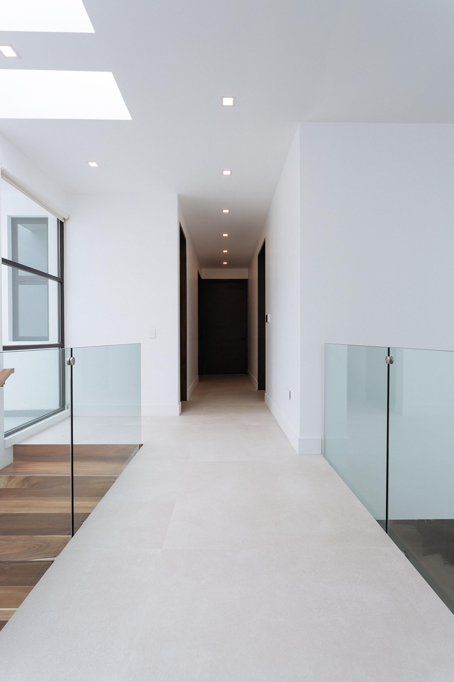 Al ingresar a la casa, hay un espacio doble altura diseñado para conectar visualmente la planta baja y la planta alta. Debajo de las escaleras esta la cava de vinos con elevadas puertas de vidrio que también cumplen con la función de barandal.