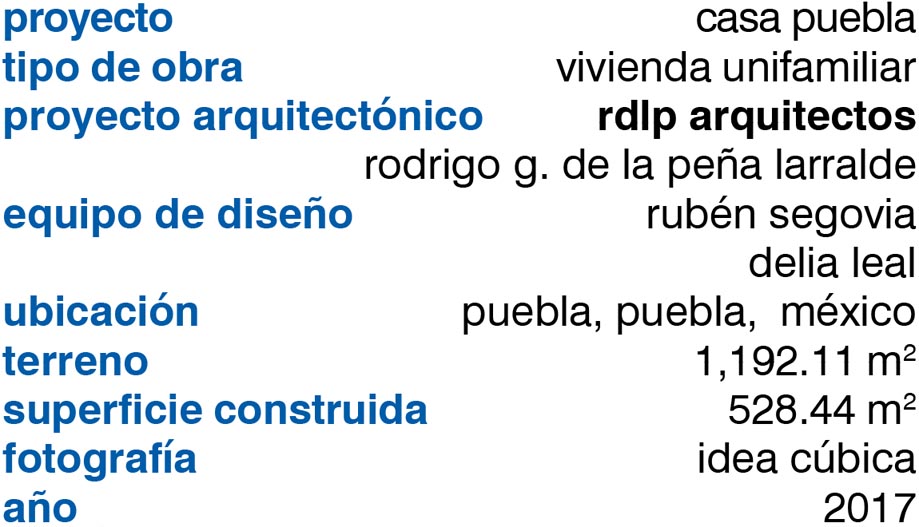 Casa Puebla se basa en un concepto de vida hacia adentro donde el remate visual y motivo recurrente es el volcán Popocatépetl, uno de los íconos naturales más importantes del centro de México. La paleta de colores y materiales sigue una gama que busca mimetizar la residencia con su contexto, a manera de un homenaje implícito al volcán.