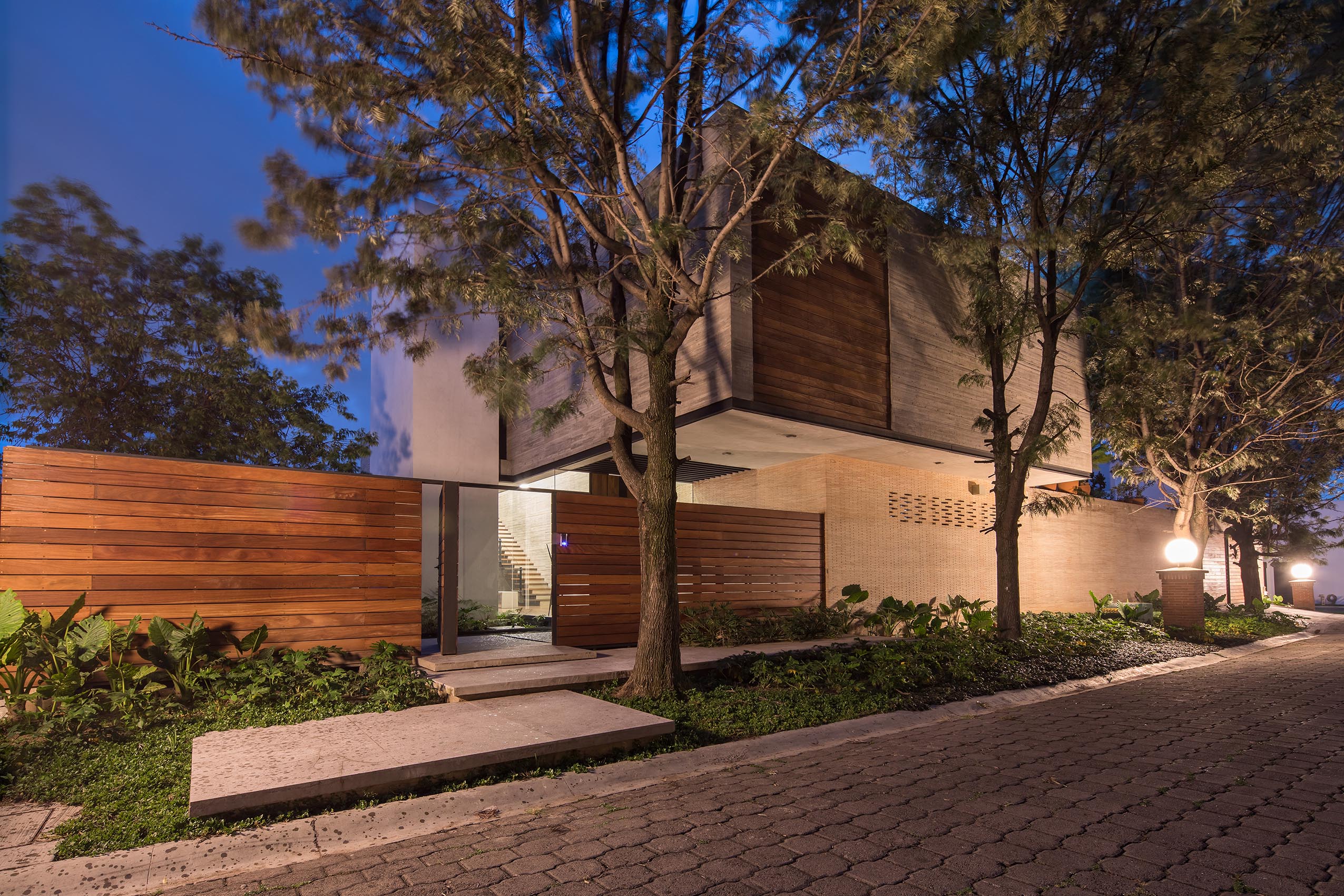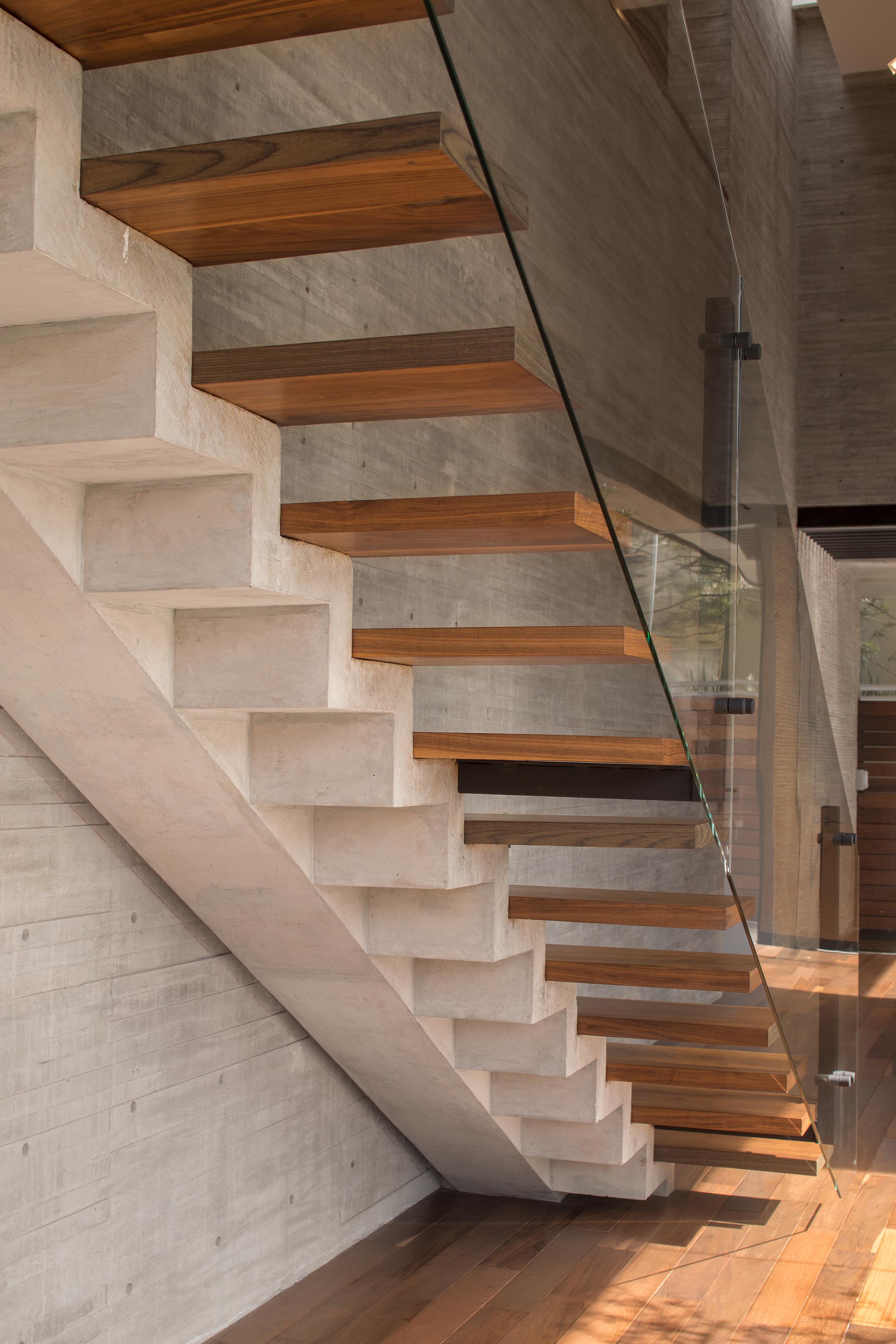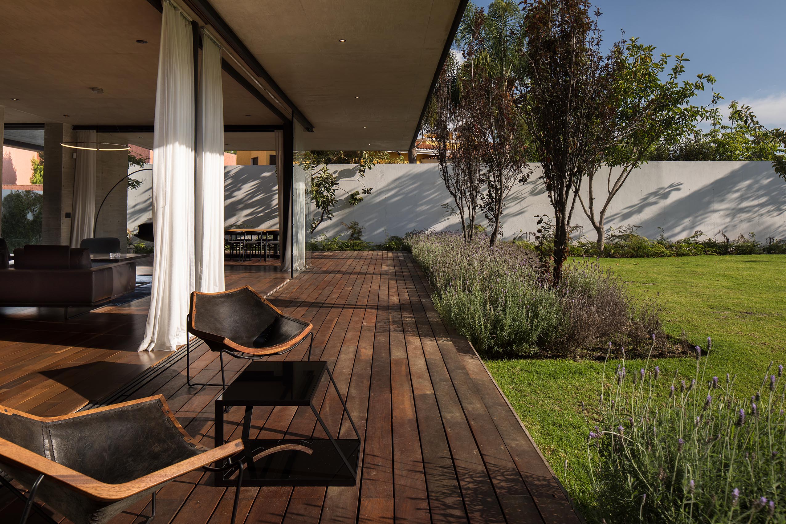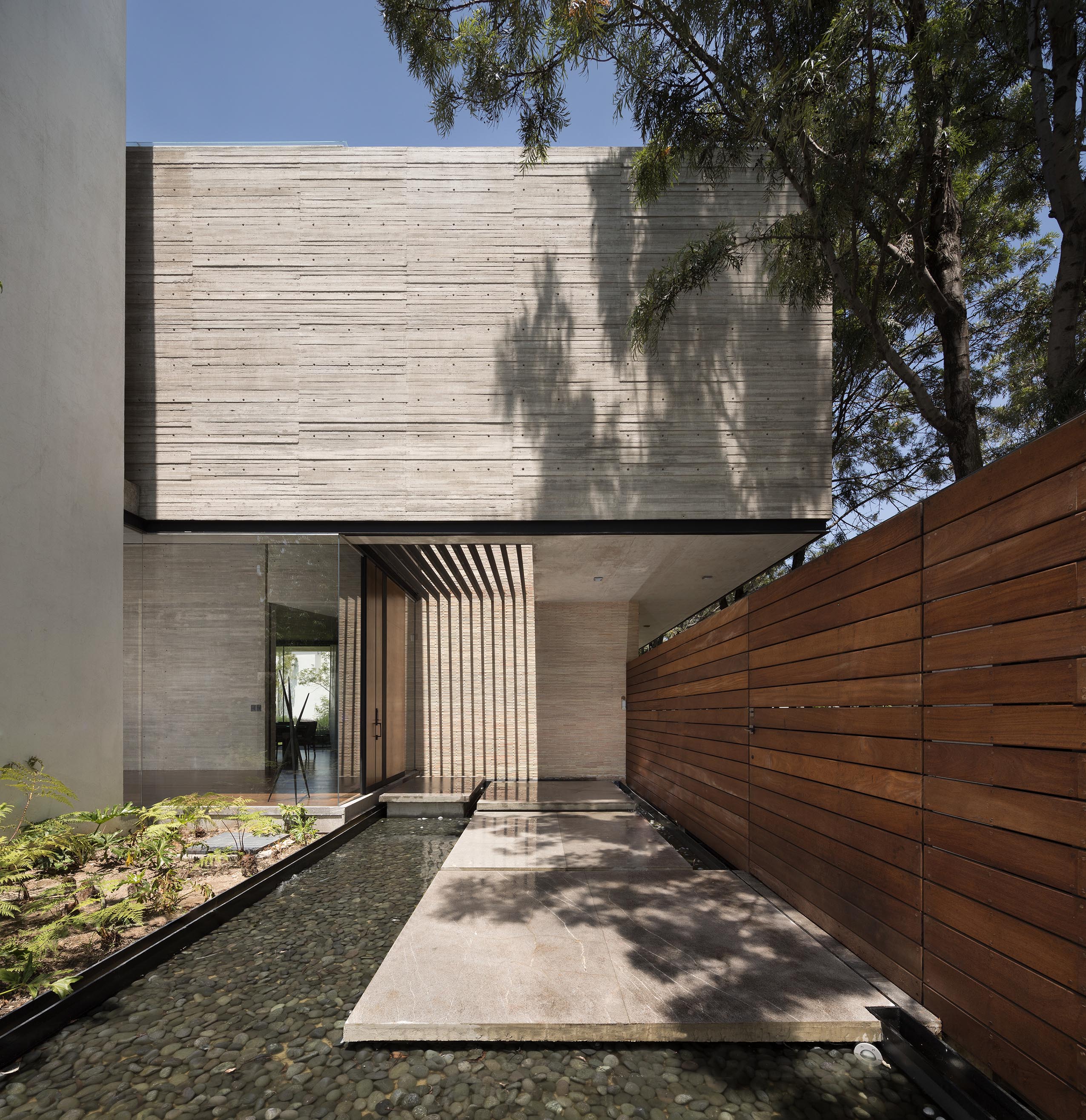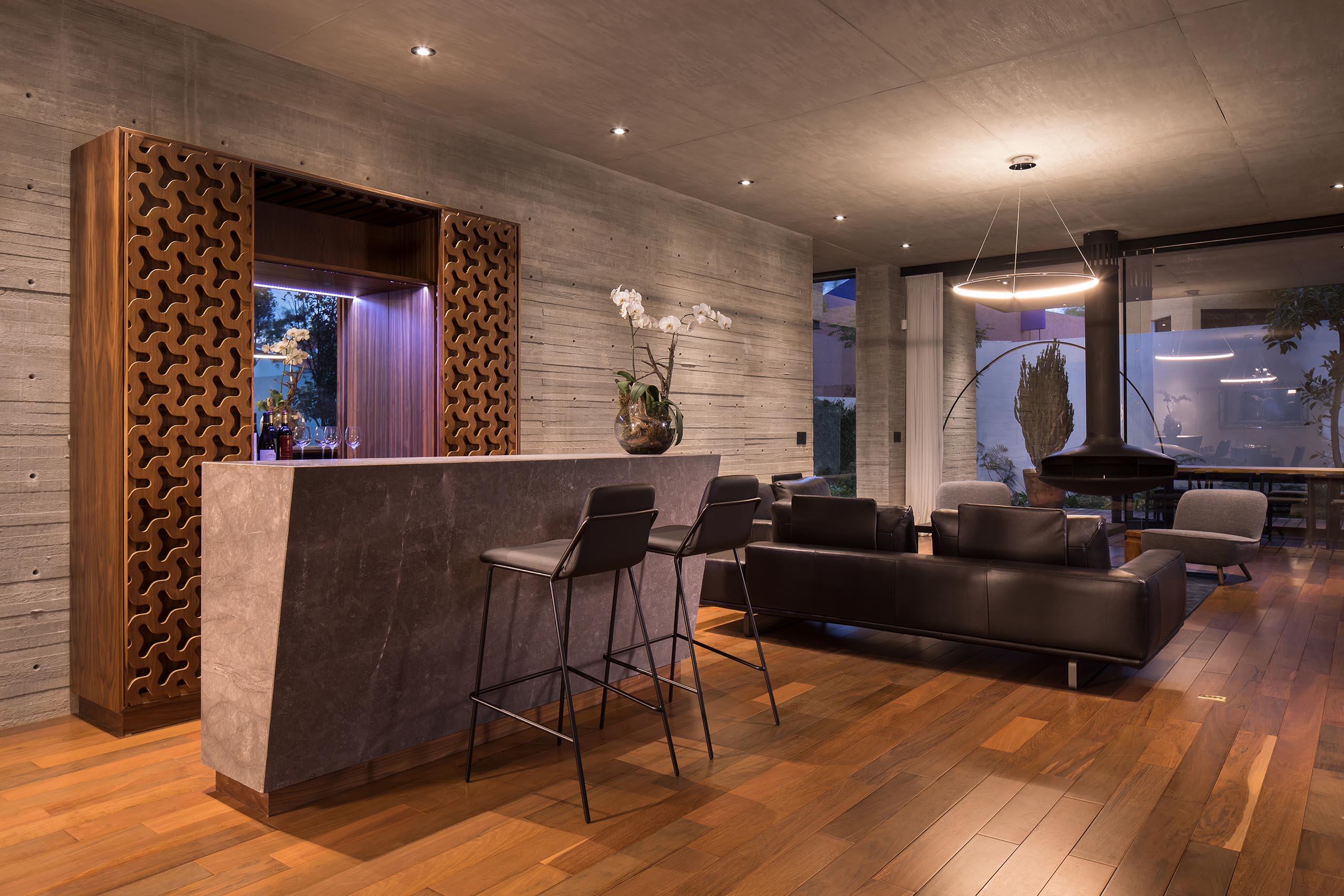 En mayor medida, el concreto aparente entablerado con superficie texturizada le imprime su identidad a la casa. Asimismo, el concreto se une a la madera en aplicaciones de duela y muro, creando un efecto de contraste entre ambos materiales. Vale la pena destacar, que el efecto de luz y sombra que se logra en el concreto gracias a la luz natural es una de las intenciones principales del diseño, creando ambientes armónicos y con gran impacto visual.