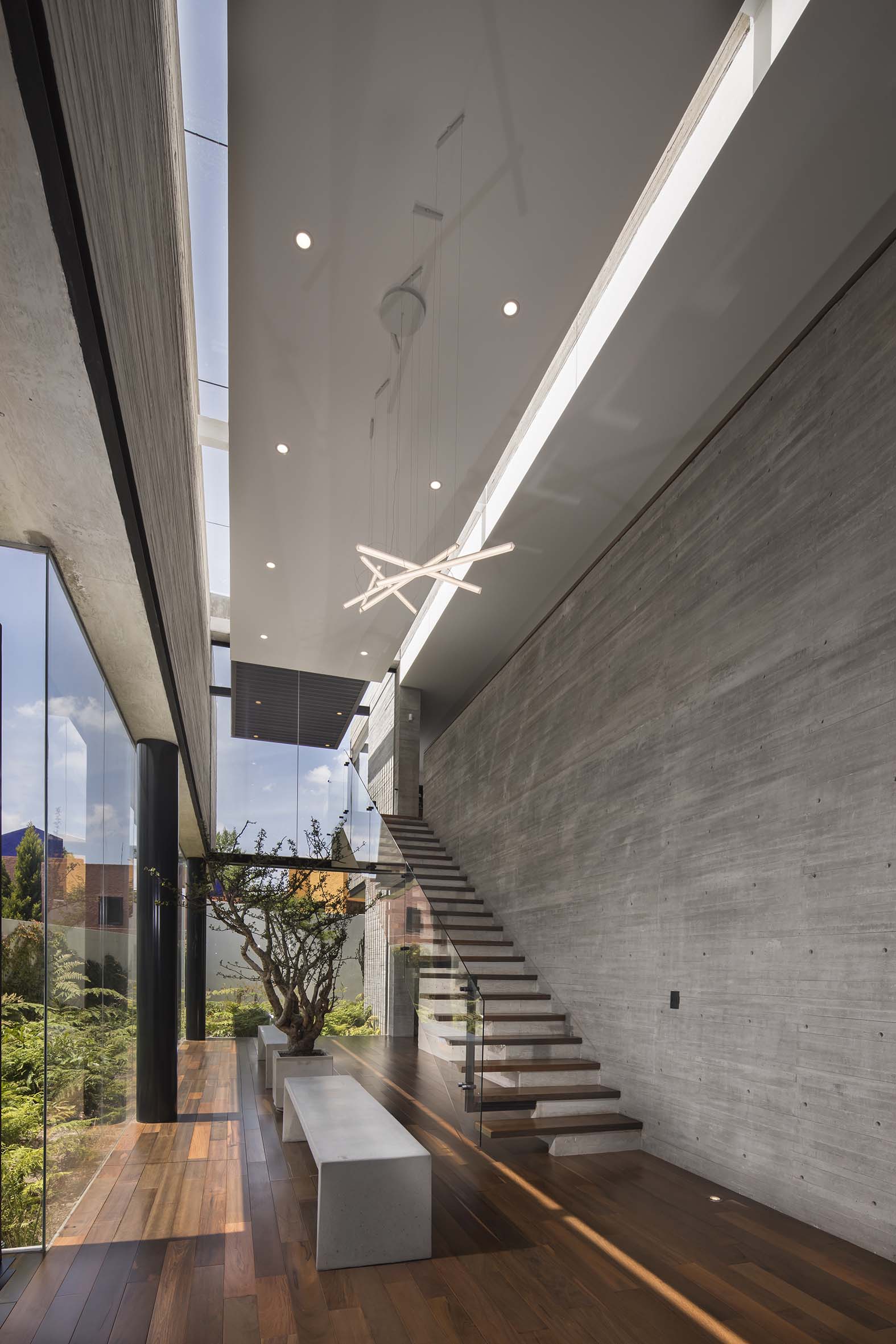 En el acceso, un volumen a doble altura se convierte en el elemento distribuidor del proyecto, tanto horizontal como verticalmente. En esta área, la escalera se convierte en uno de los detalles principales de diseño, gracias a su estructura de concreto y huellas flotadas de madera.