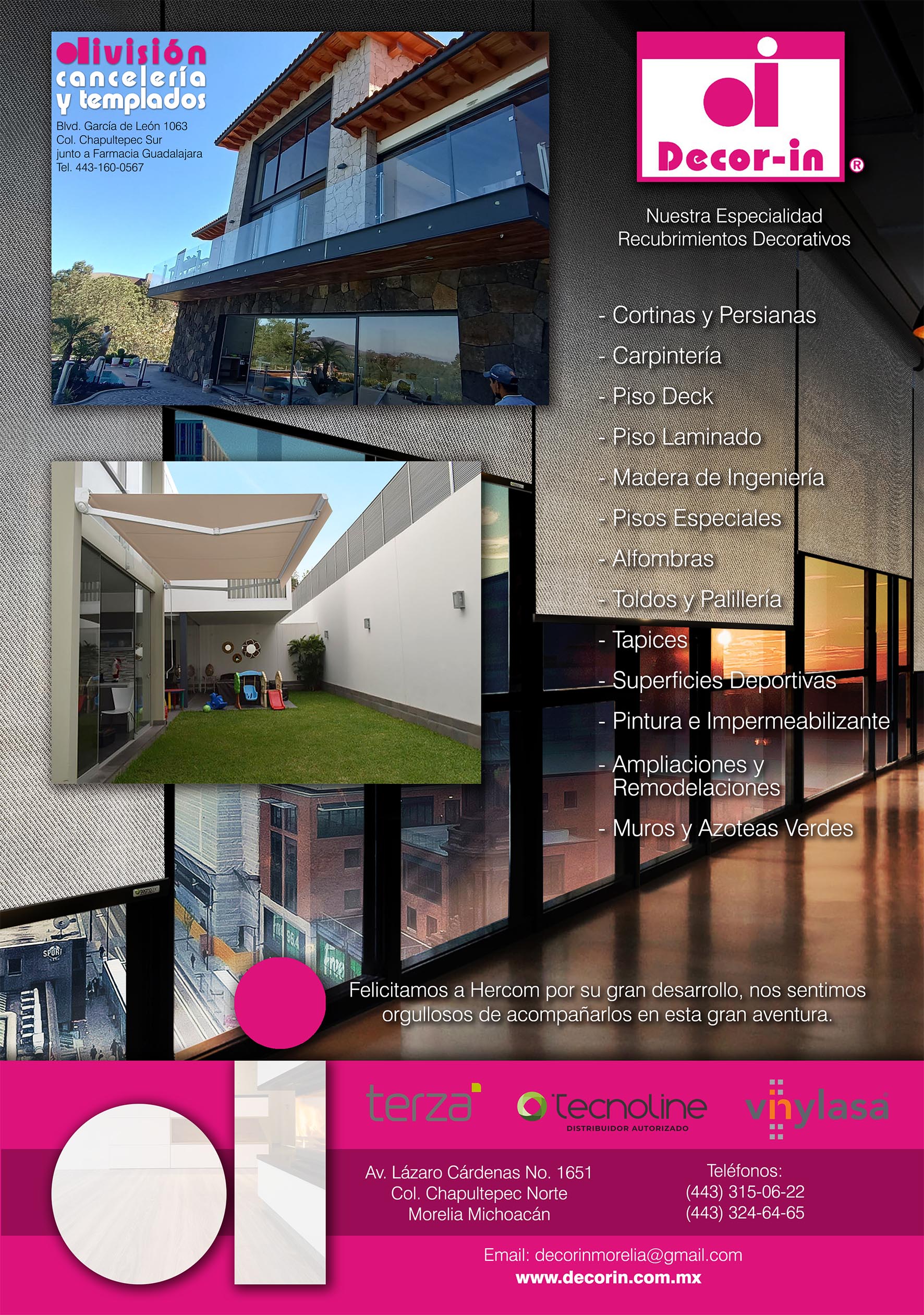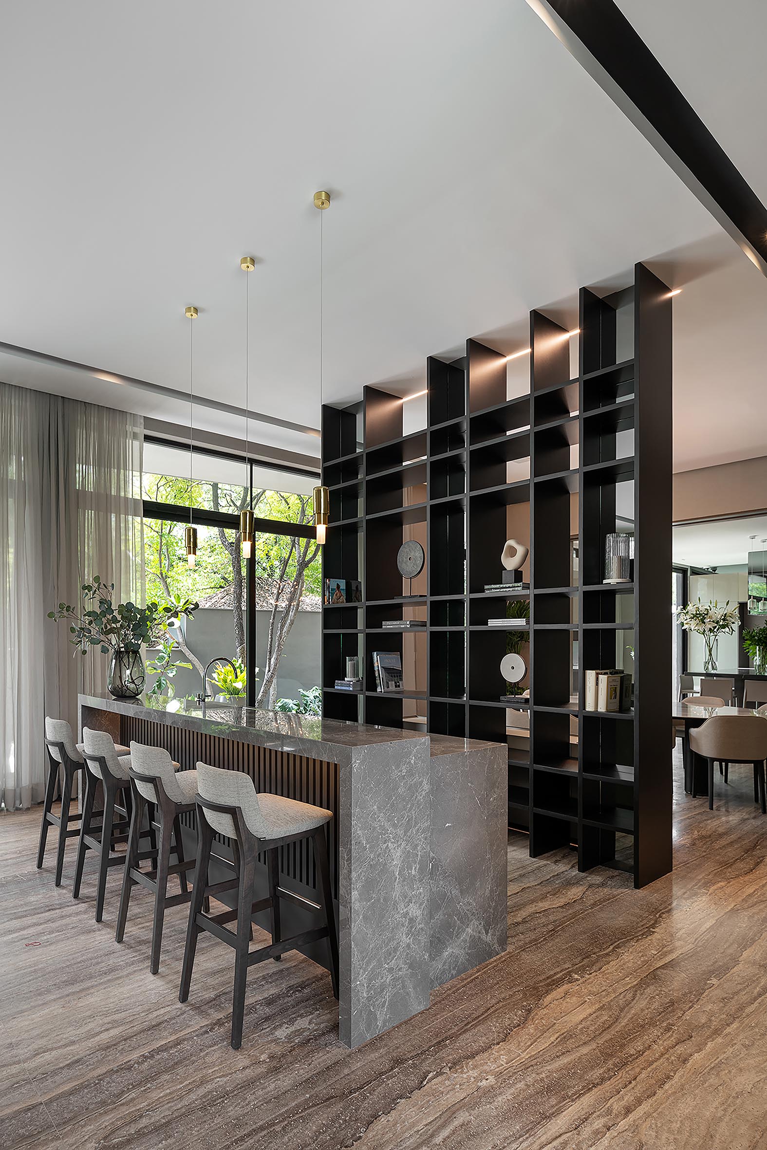 Al entrar por el recibidor principal una celosía con paneles de madera y mármol, te deja entrever el área social. La sala y comedor que están separados por el bar y una celosía que abarca la altura del espacio, tienen una conexión directa al exterior por medio de grandes ventanales. Al comedor y la cocina, los dividen dos grandes puertas corredizas que al estar cerradas forman un gran lambrín de madera, pero al abrirse crean un espacio continuo.