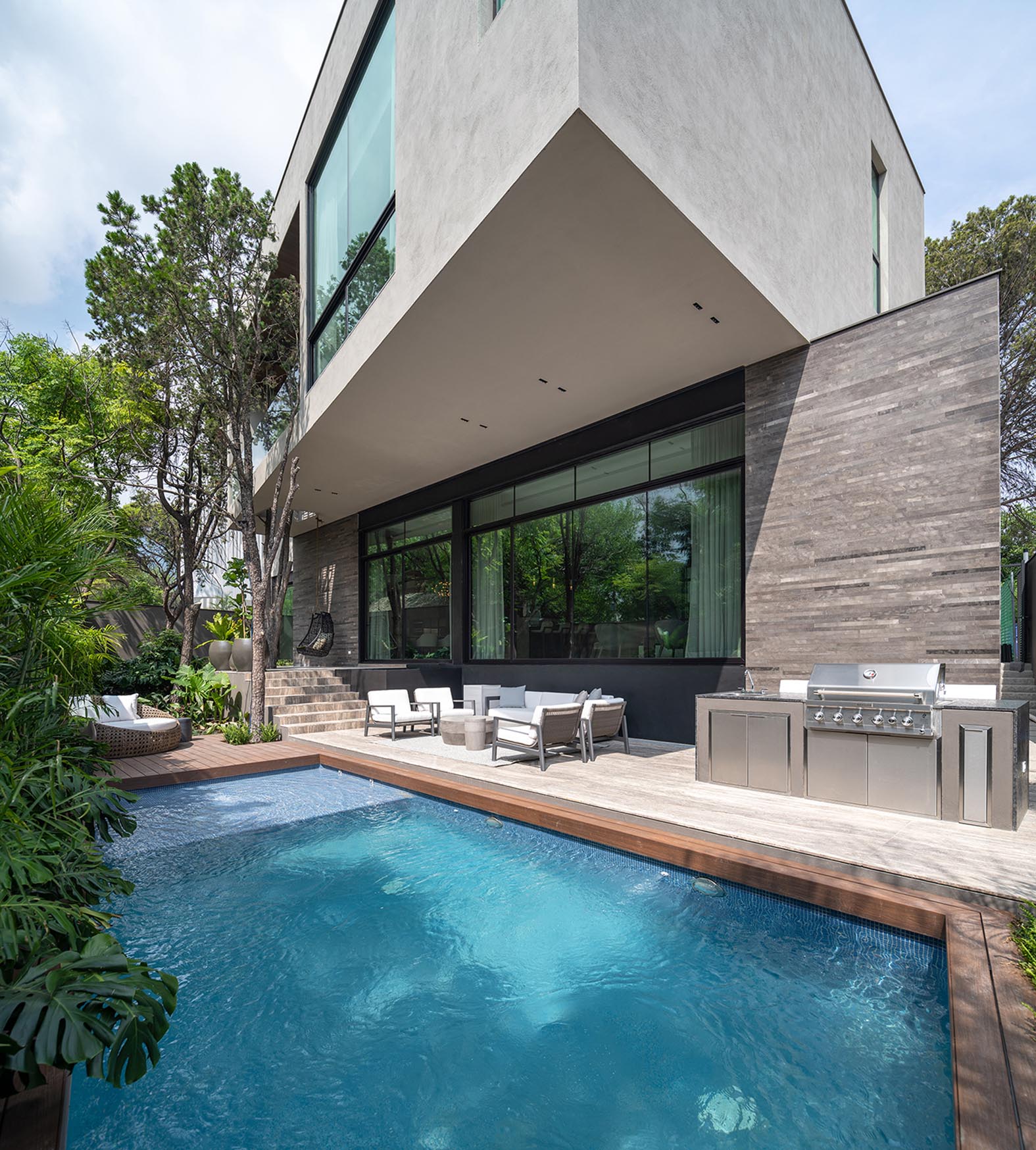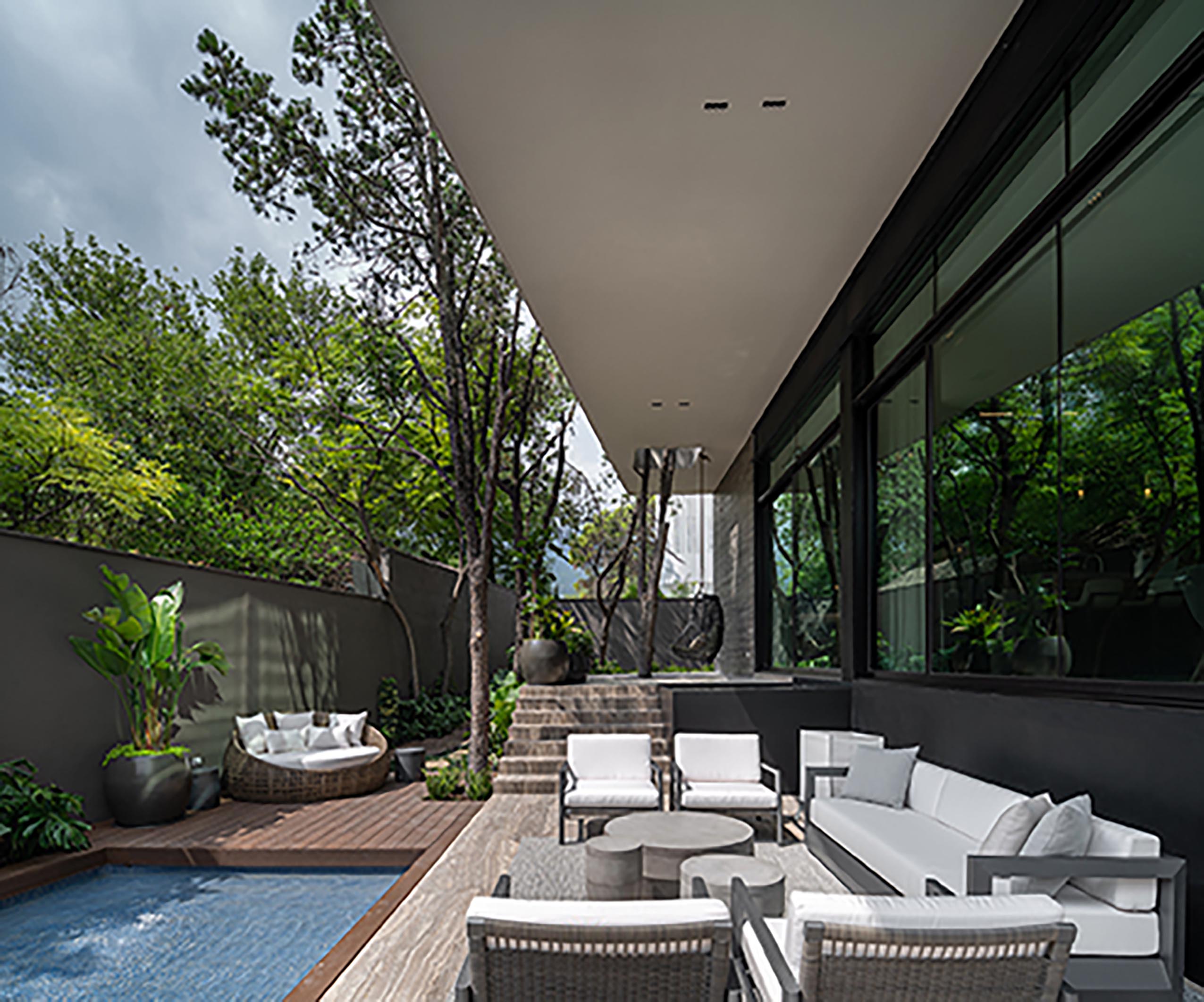 El patio exterior tiene un nivel diferente al interior de la casa y al salir llegas a una plataforma en donde un gran árbol emerge a través de la casa, pasando por la losa de entrepiso hasta llegar a la azotea. A pesar de no tener un jardín plano, dicho espacio exterior, es un área con vegetación abundante y gracias a los volados formados por la planta alta, se crea una zona fresca que evoca serenidad.