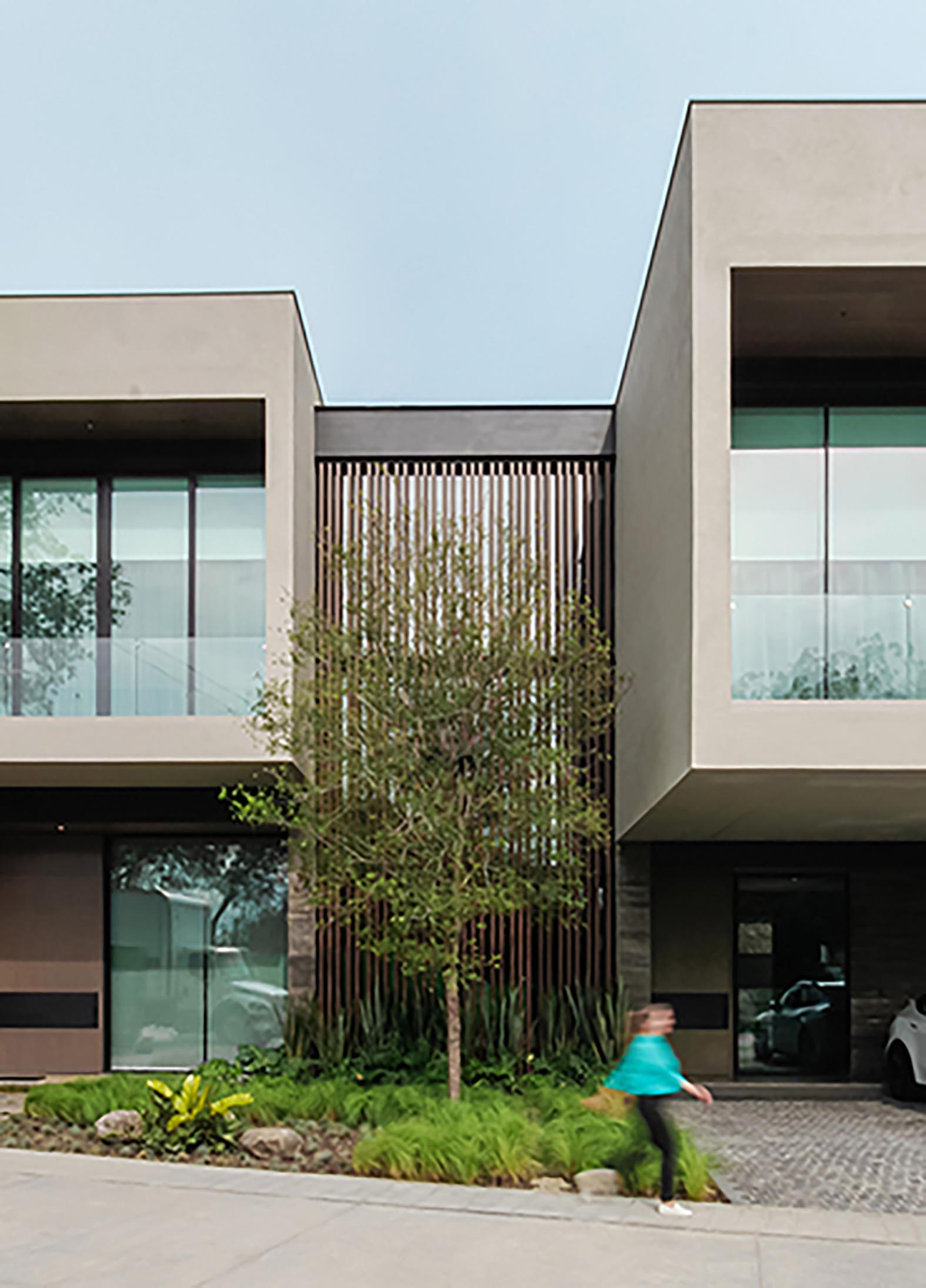 Desde la fachada principal la planta baja funciona como basamento para los bloques extruidos en la planta alta, formando dos volados de diferentes profundidades. Mientras que, remetidas en medio de estos dos bloques, unas tiras de madera verticales forman una celosía que emerge desde la vegetación del jardín en la fachada principal y llegan hasta la parte superior de la casa.