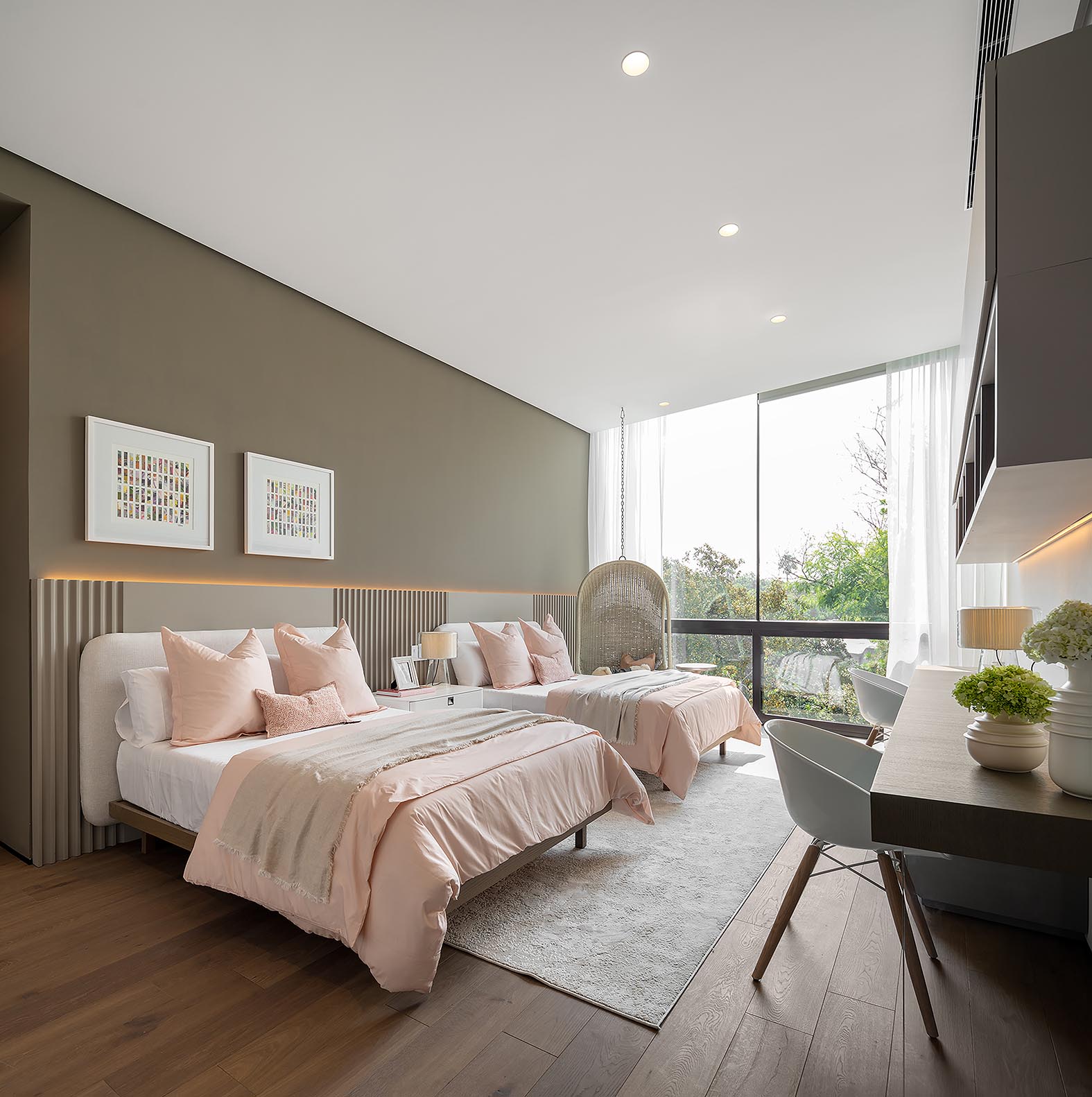 En la planta alta la recámara principal se encuentra en un nivel diferente con respecto al resto de las habitaciones. Para llegar a la estancia familiar debes subir una pequeña escalera formada por bloques de madera y mármol. El área social de la planta alta tiene acceso directo a una terraza que es atravesada por el árbol que emerge de la planta baja. Desde este mismo espacio se disfrutan las copas de los árboles de las casas circundantes.